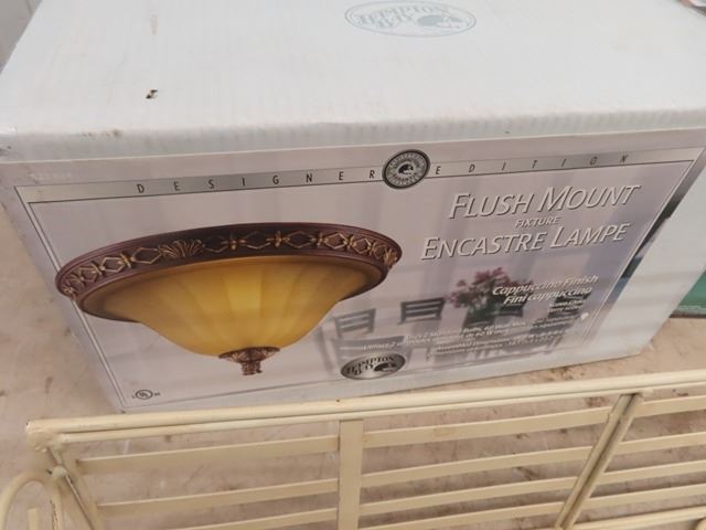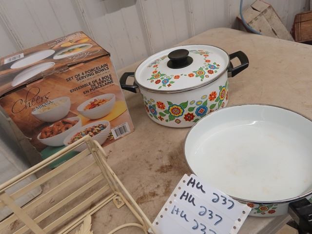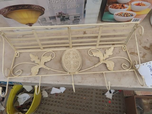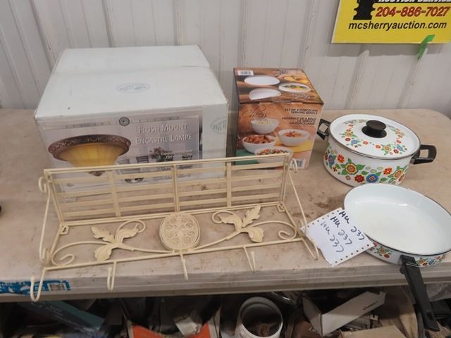 New Light Fixture, Metal Rack & Porc Serving Bowl & Pots