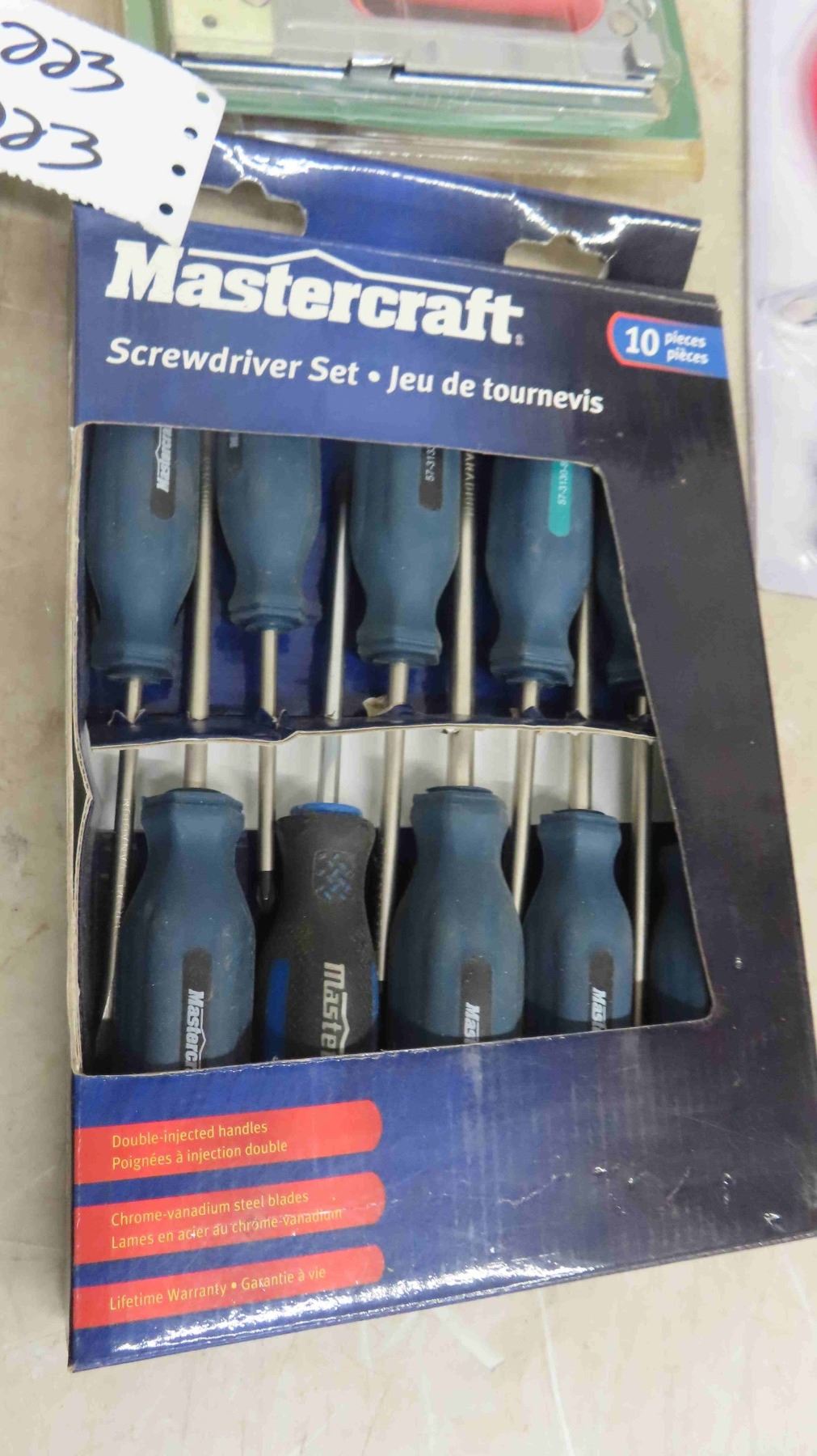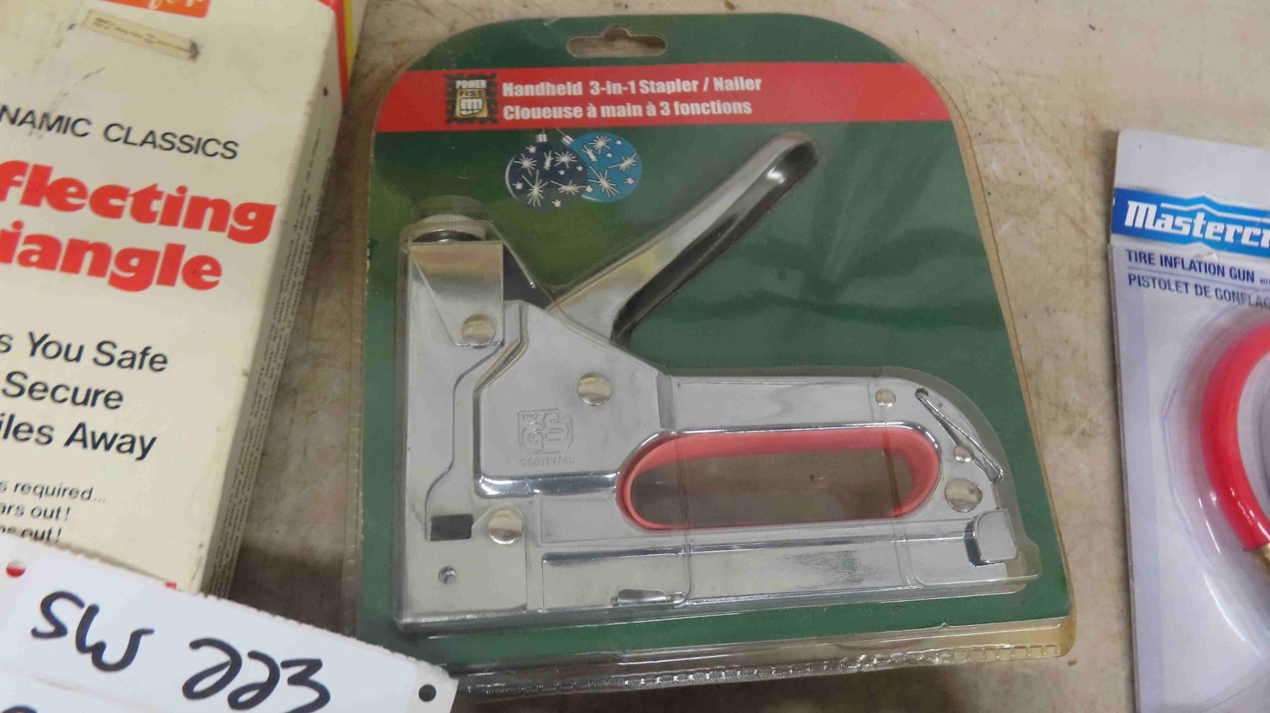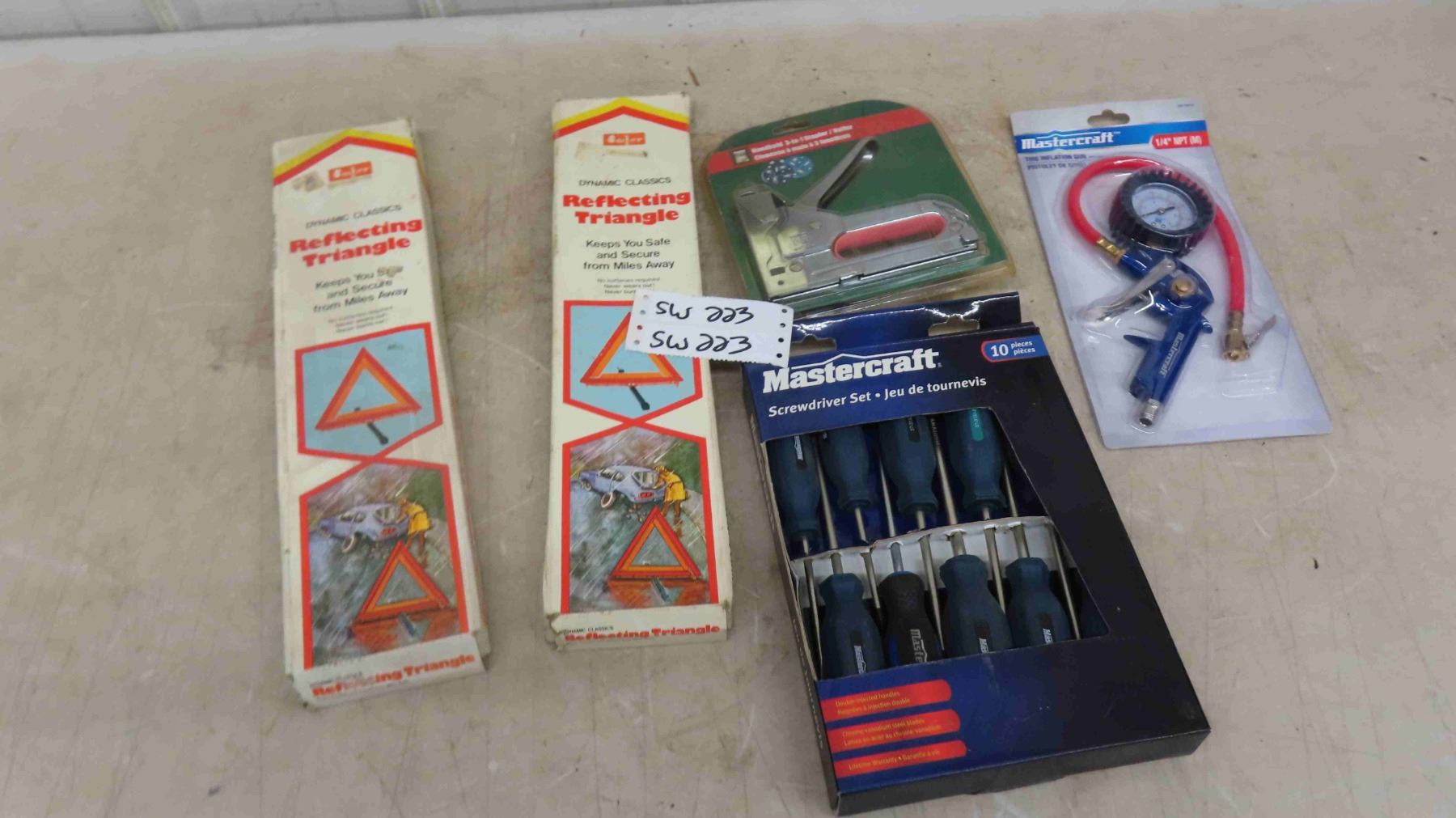 New: Mastercraft Screwdriver Set , Triangle Reflectors, Mastercraft Tire Inflation Gun , Powerfist Handheld 3 in 1 Stapler/Nailer