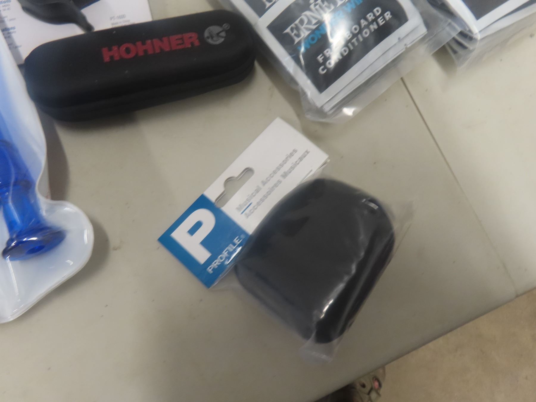 New Music Package, Guitar holder, Picks, Tuner, Strep. Strings. Cleaning Wipes, Recorder, Harmonica