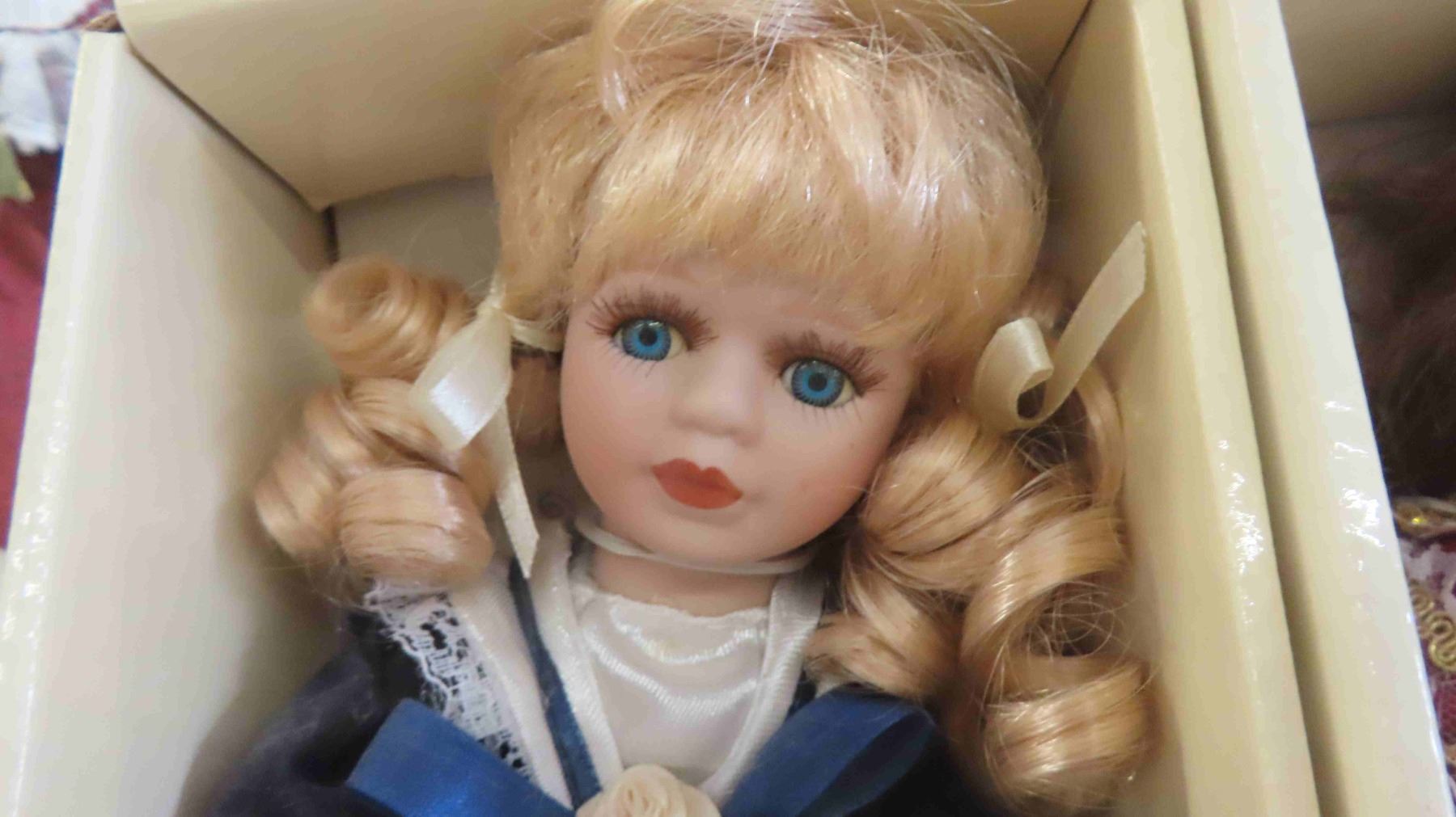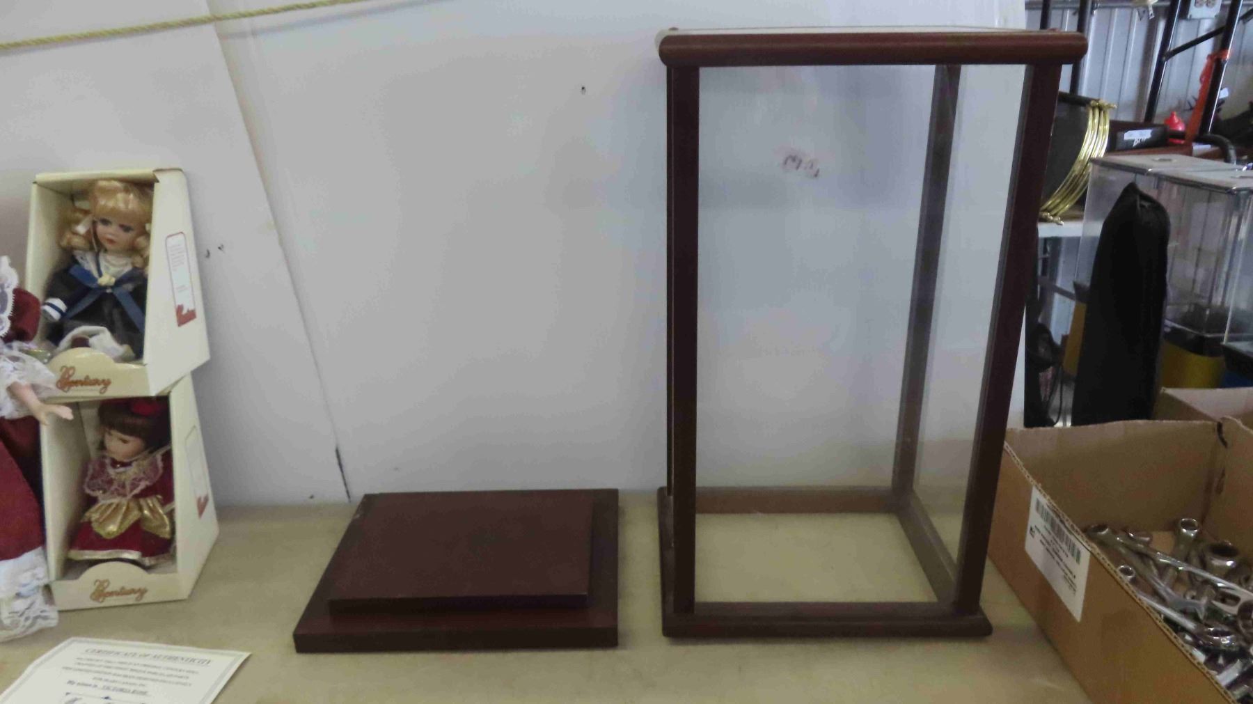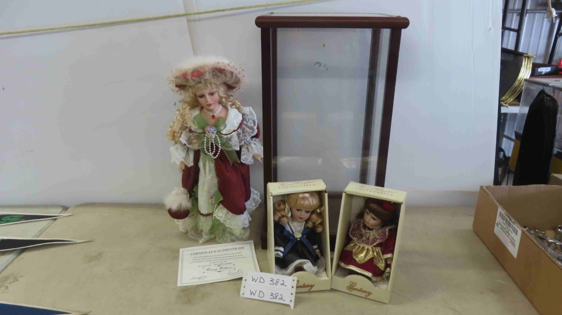 New Old Stock 3 Collector Dolls , Wood Display Case 10 1/4'' x 8 3/4'' x 20''