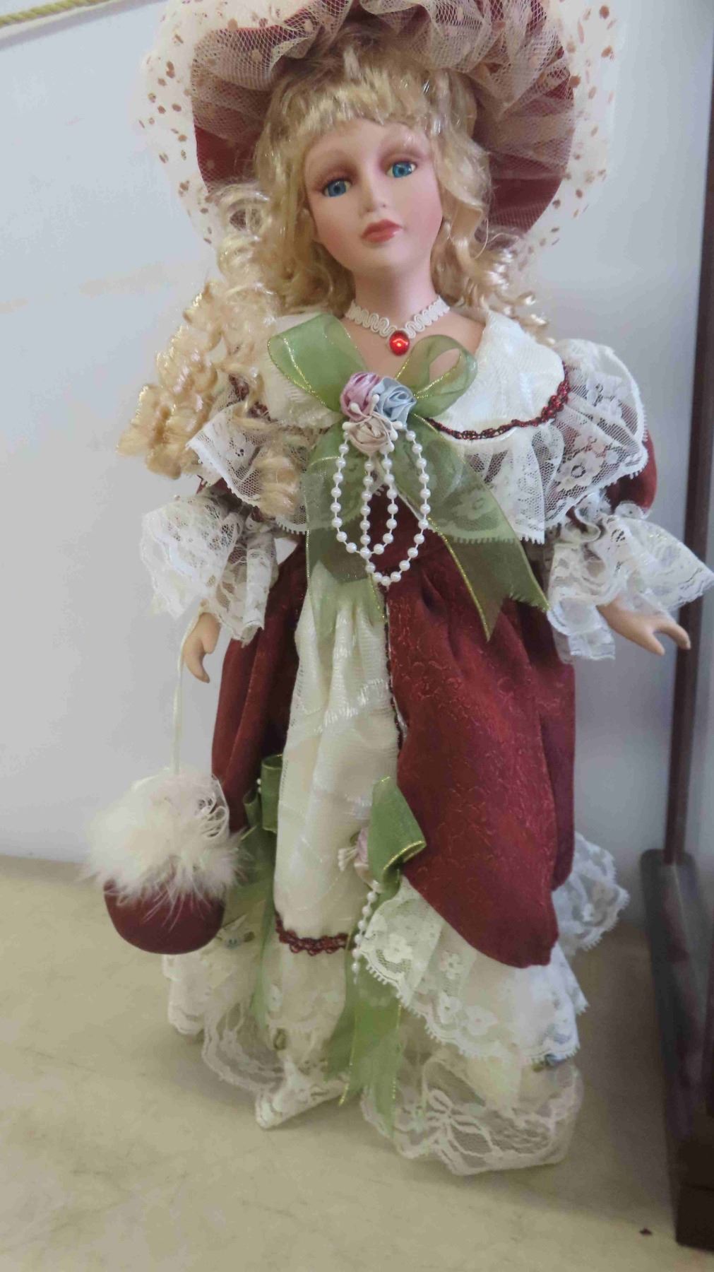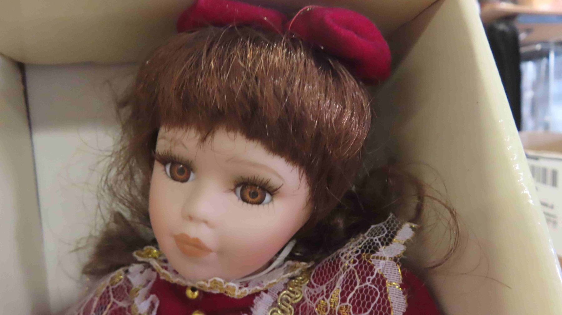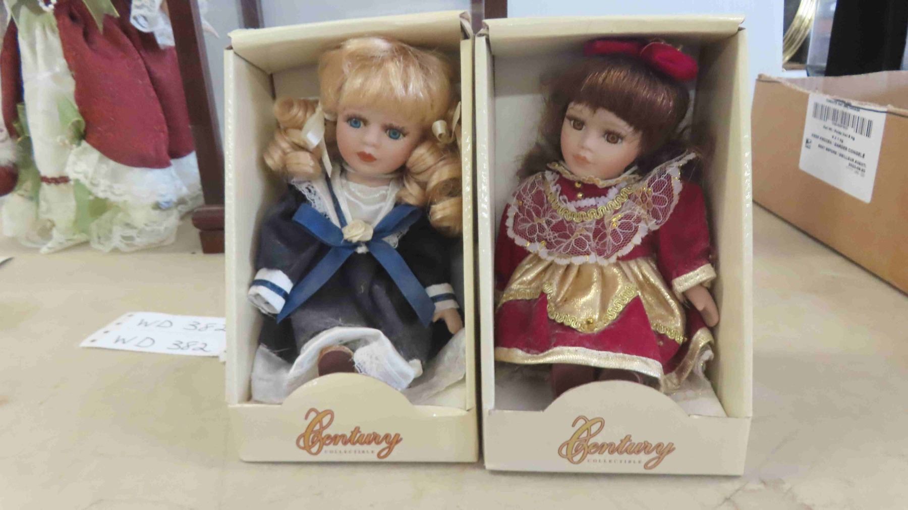 New Old Stock 3 Collector Dolls , Wood Display Case 10 1/4'' x 8 3/4'' x 20''