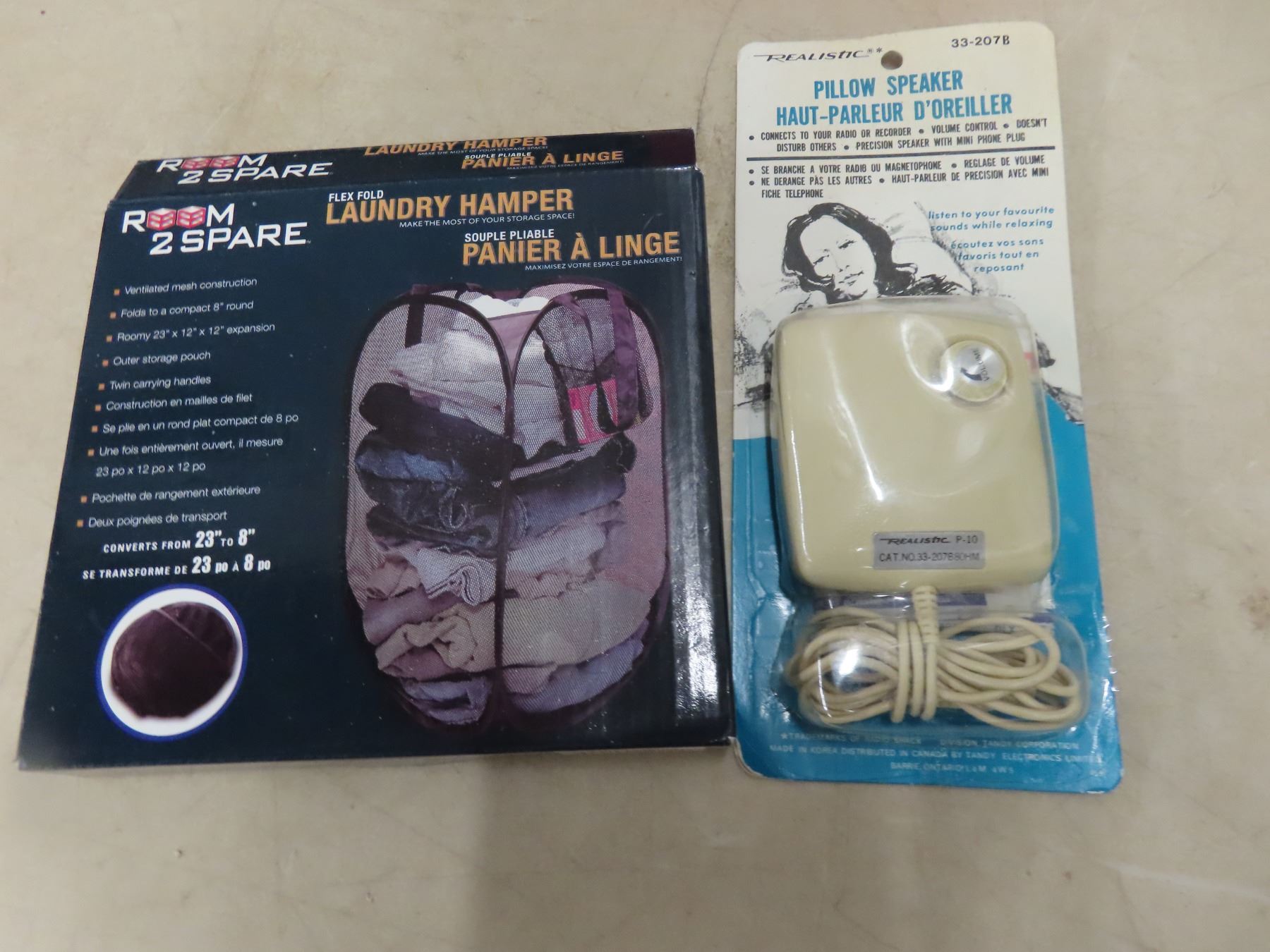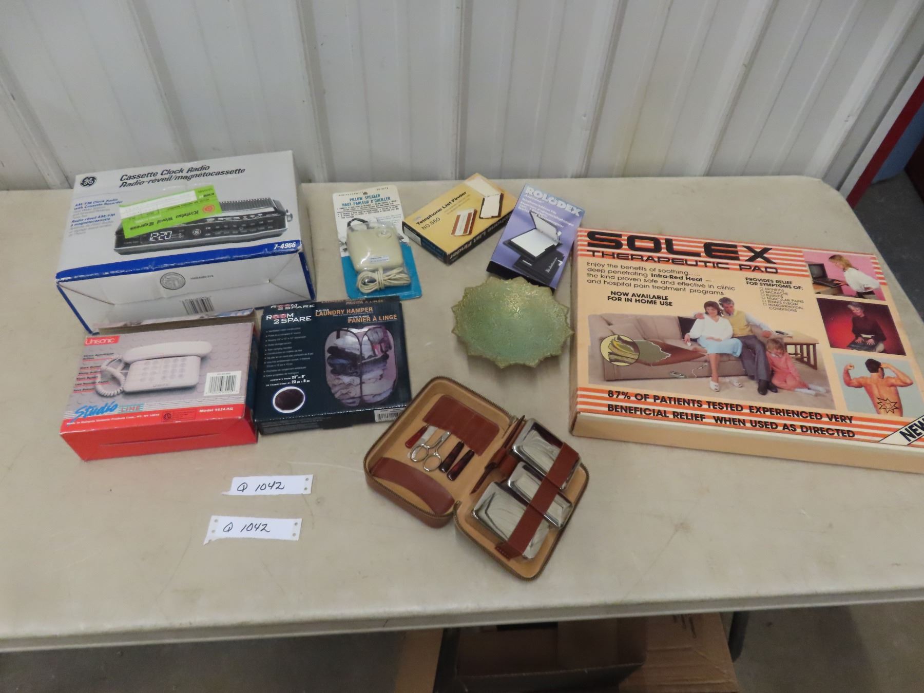 New Old Stock Cassette Clock Radio, Pillow Speaker, Phone, Laundry Hamper, Grooming Kit, Solex Pad