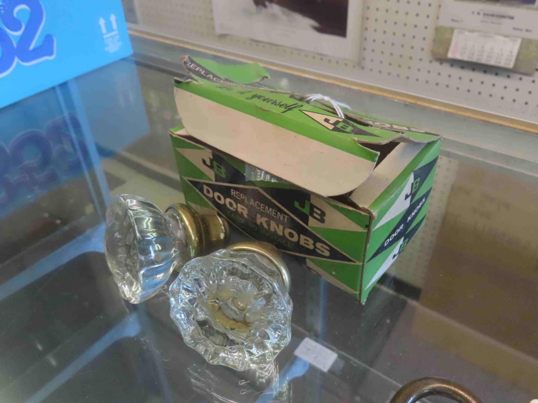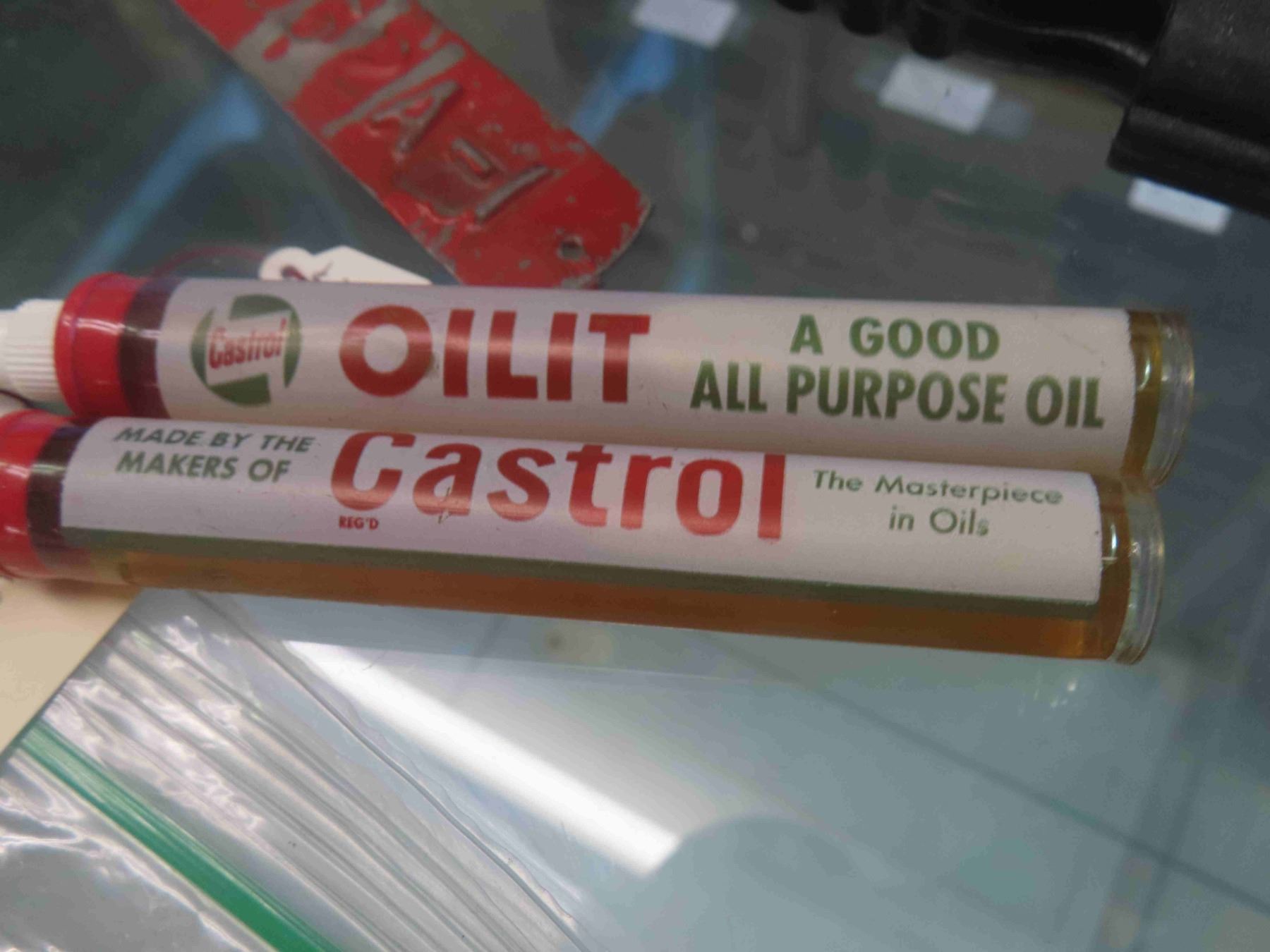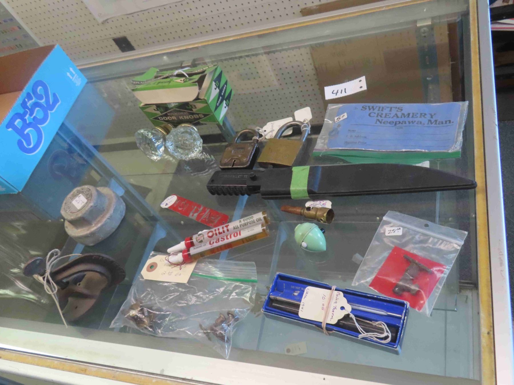 New Old Stock Glass Door Knobs with Box, 2 Castrol Oil Tubes, McLaughlin Cap, Tire Patch, Pad Locks