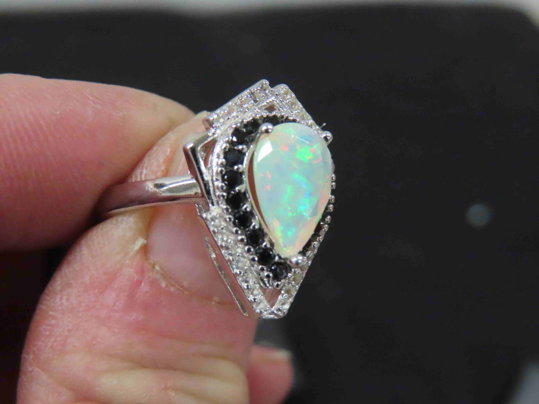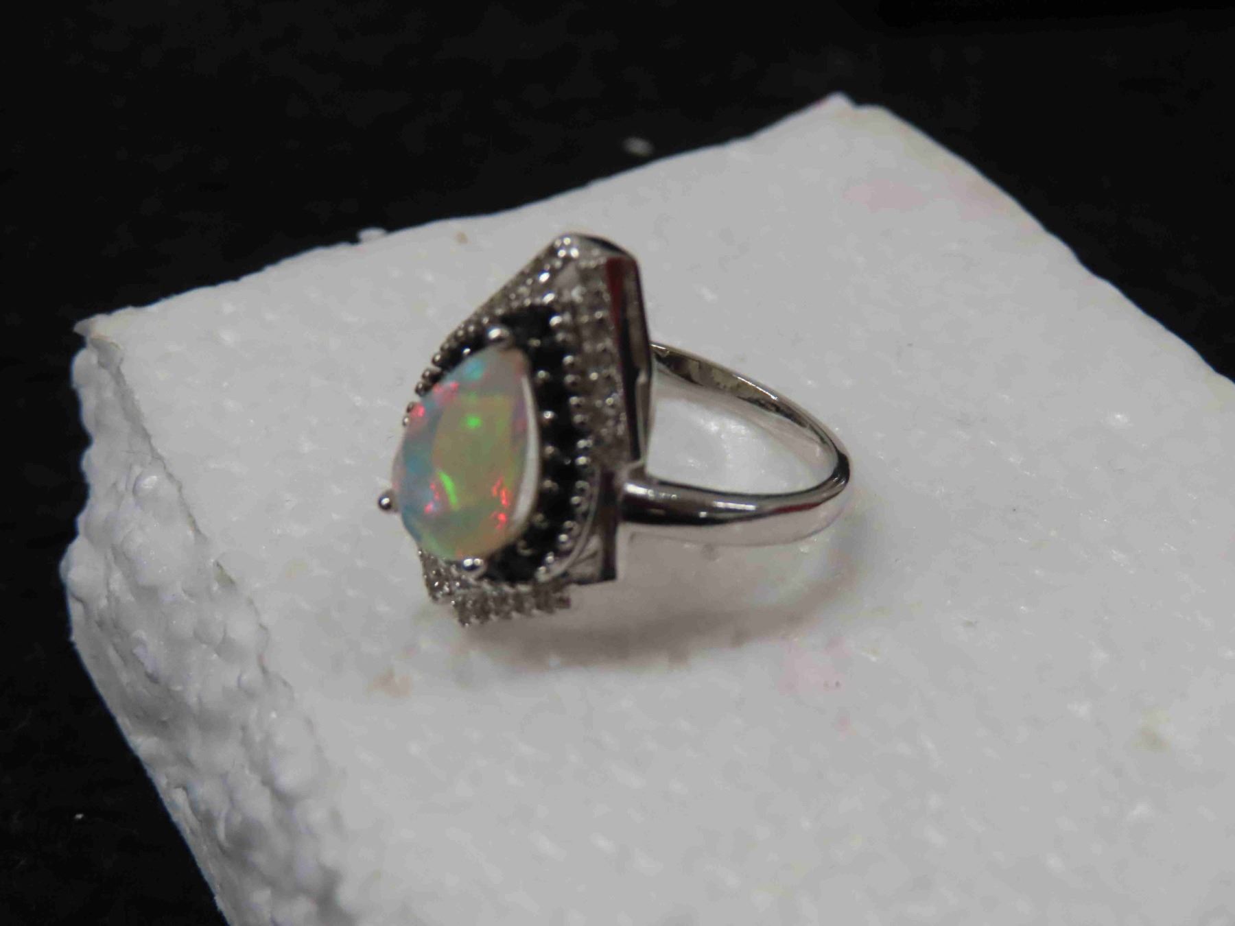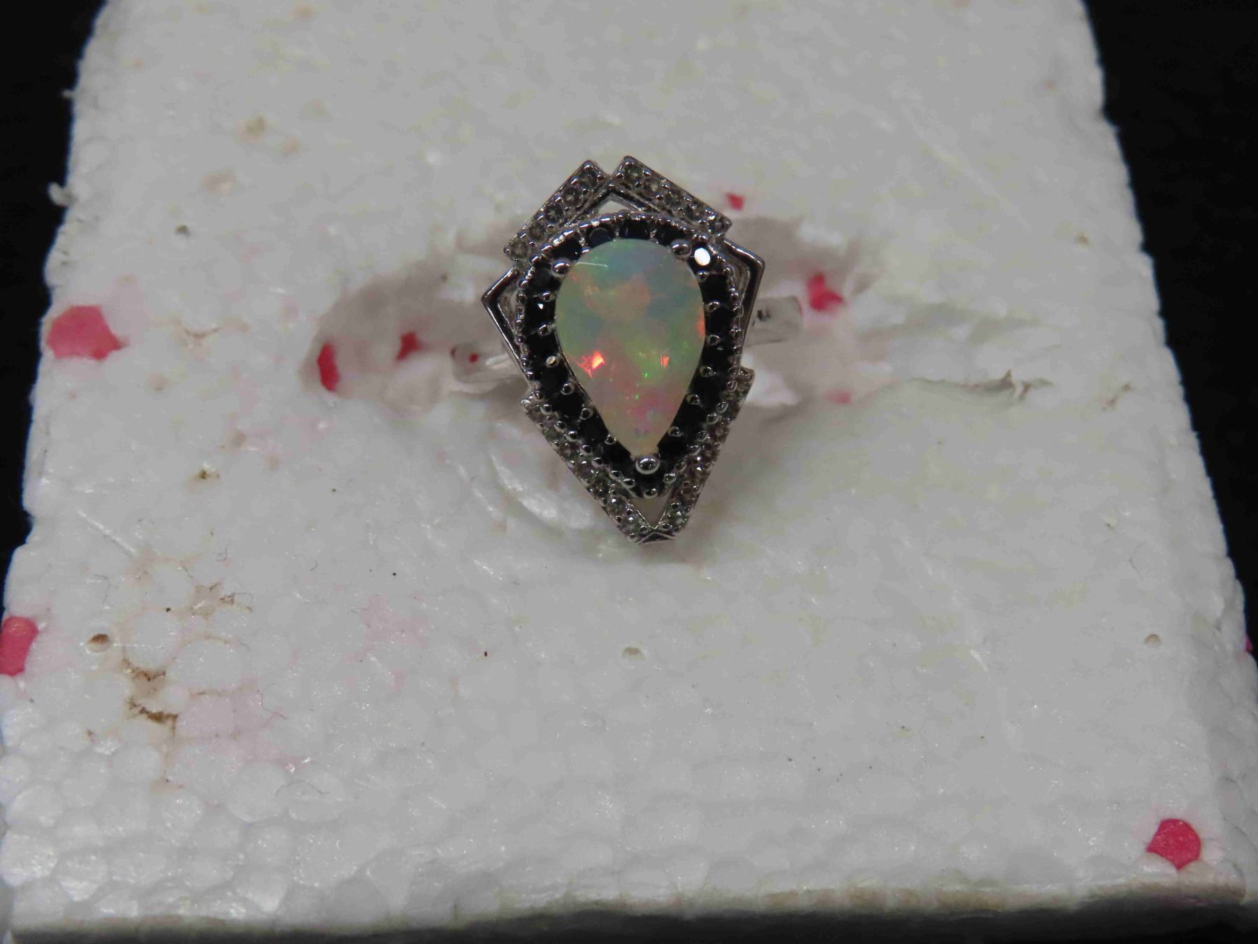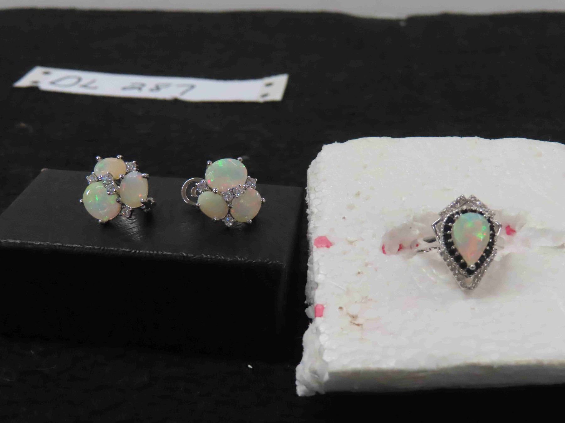 New Opal Ring and Earrings Combination : RING - Pear Shaped Fire Opal 10mm x 7mm Surrounded by Black Spinel on Sterling Silver , Weight 3.90 Grams Size 6 : EARRINGS - Oval Fire Opal on Sterling Silver with Zirconia Weight 6.00 Grams