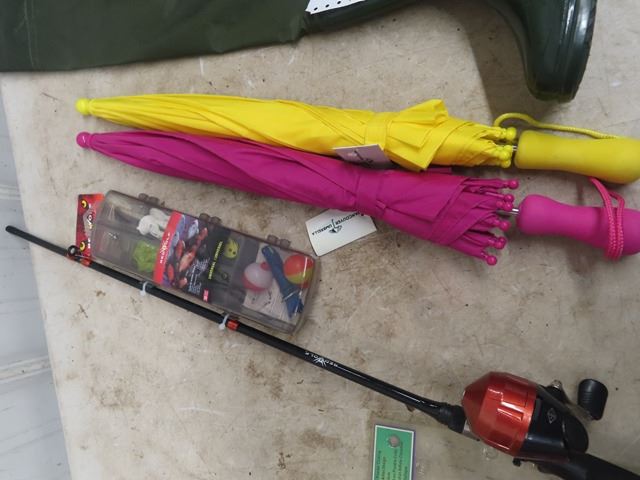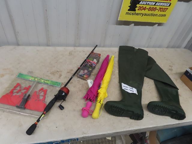 New sz 3 Hip Wader, Fishing Rod & Reel w/ Tackle &2 Umbrellas