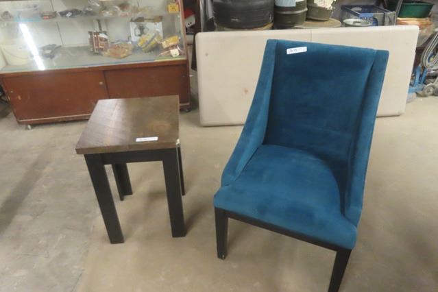 Nice Blue Upholstered High Back Chair with Wood Side Table 25 x 18 1/2 x 17''