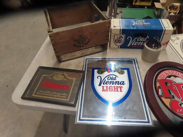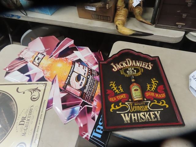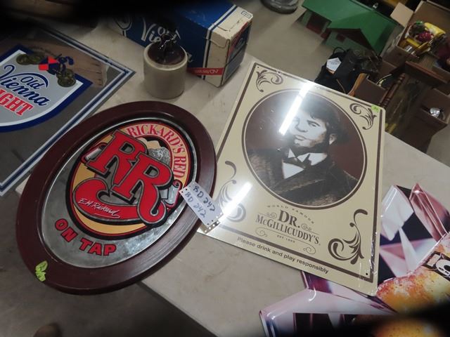 OV Advertising Mirror, Case of 12 OV Stubby Beer Bottles, Tin Budweiser Signn, Wooden Jack Daniels 3D Sign, Rickard's Red Mirror Sign, Hamms Mirror, Dr. McGillicuddy's Tin Sign + Whiskey Jug & Beer Crate