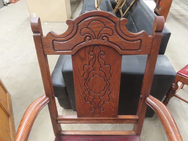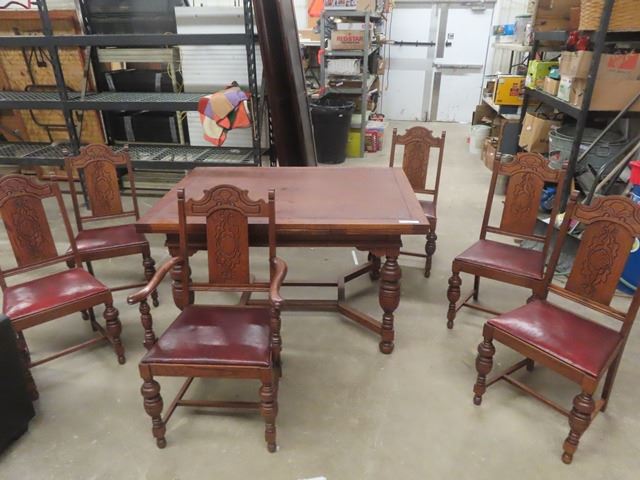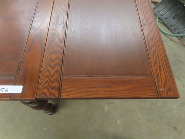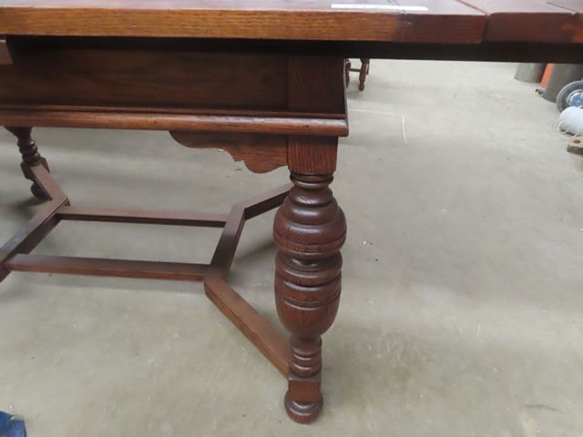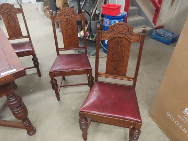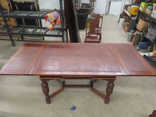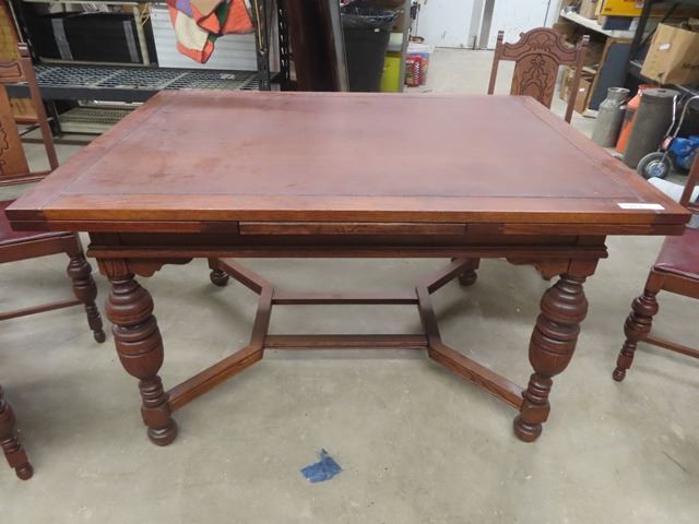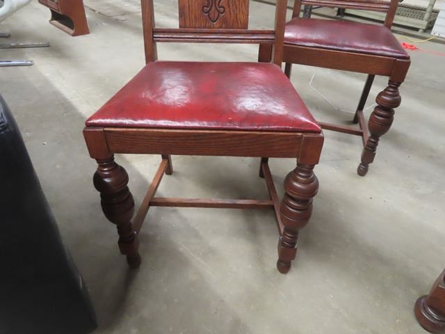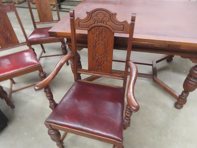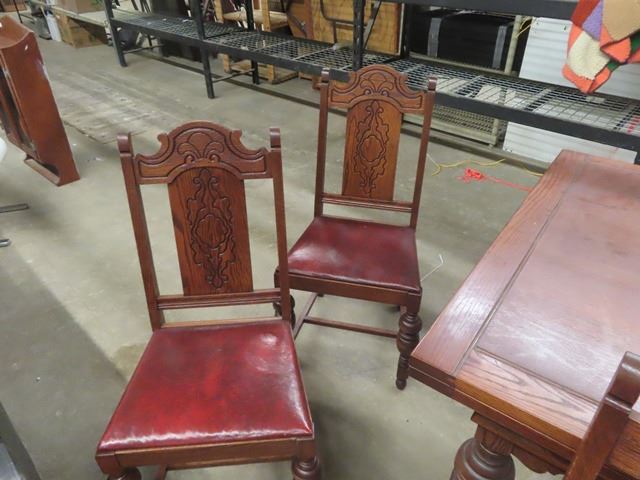 Oak Dining Room Table 31" x40"x 54" with 6 Chairs - Krug- Leather Upholstered Seats , Table Has 2 End Pull Out 18" Leaves