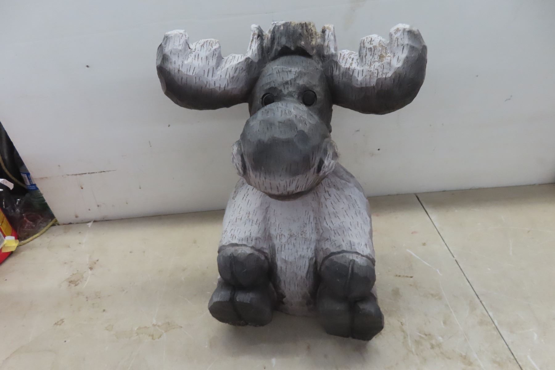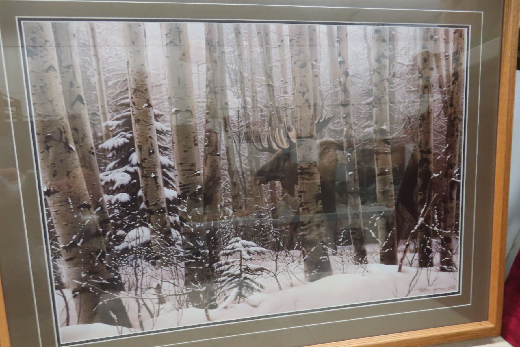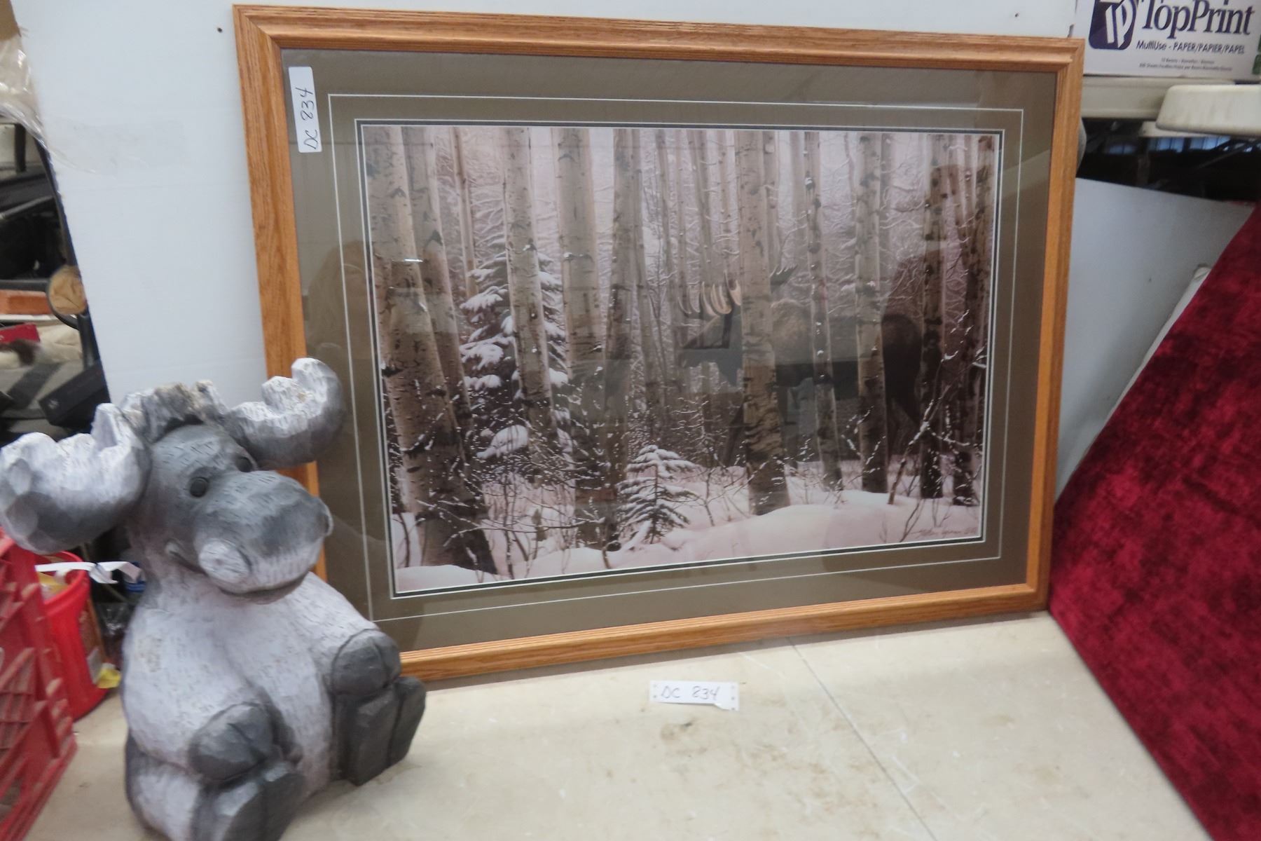 Oak Framed Picture 31 1/2x41 and Wood Carved Moose 16'' Tall Great for The Cabin