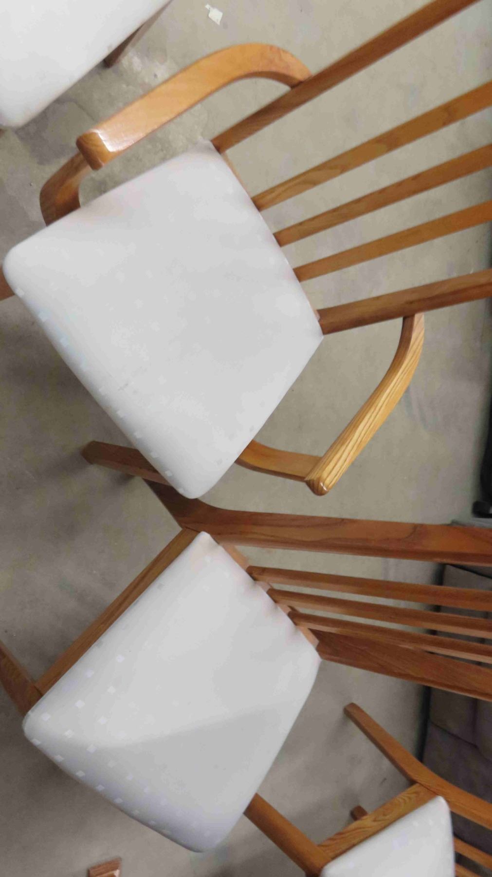 Oak Table 30" x 38" x 68" + (1) 24" Leaf & 6 Chairs - 2 are Captain's
