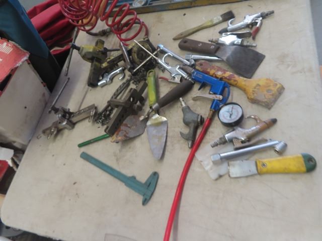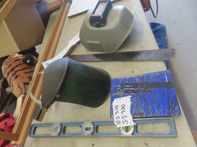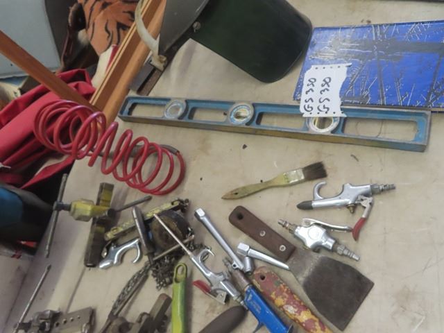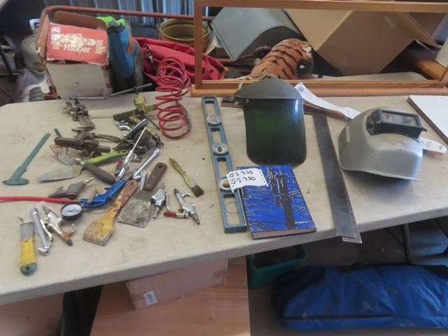 Odds n Ends of Tools; Flaring Tool , Air Gauge/ Blower, Level, Square, Welding Helmet plus more