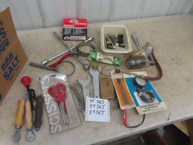 OddsnEnds of Tools ; Air Gauge, Wrenches, Scissors Propane Torch, Organizer, Staples, Stud FInder plus more