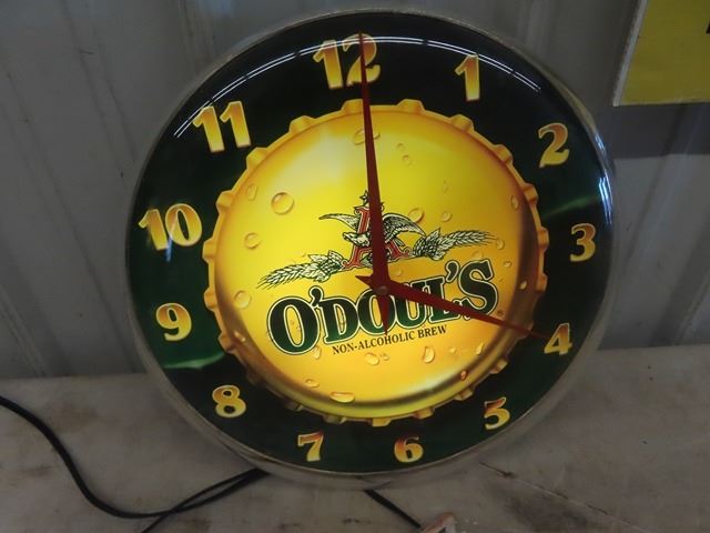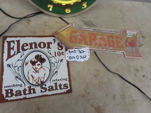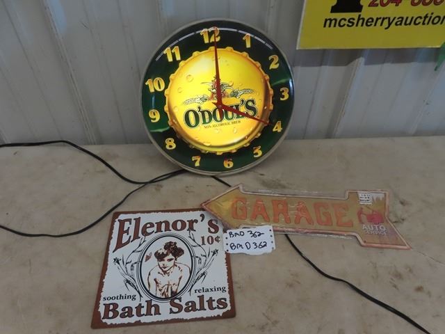 Odoul's Light Up Beer Clock 14" Rd & 2 Modern Metal Signs - Elenor's 10" x 10" & Garage 6" x 12"