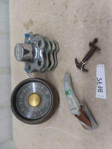 Old Car Speedometer, 4 Chevy Center Caps, Oil Spout, Hood Clamp