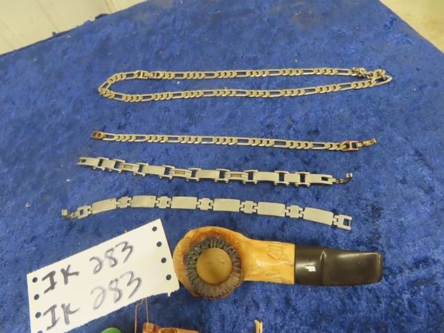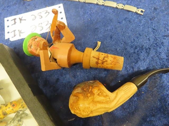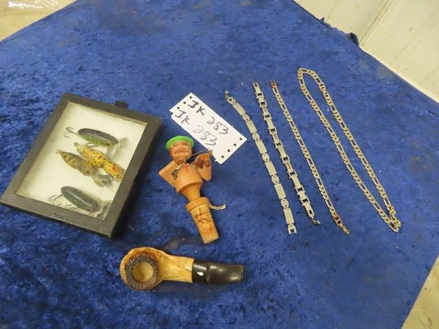 Old Fishing Lures, Wooden Caved Whiskey Stopper, Carved Pipe & Men's Bracelets & necklace