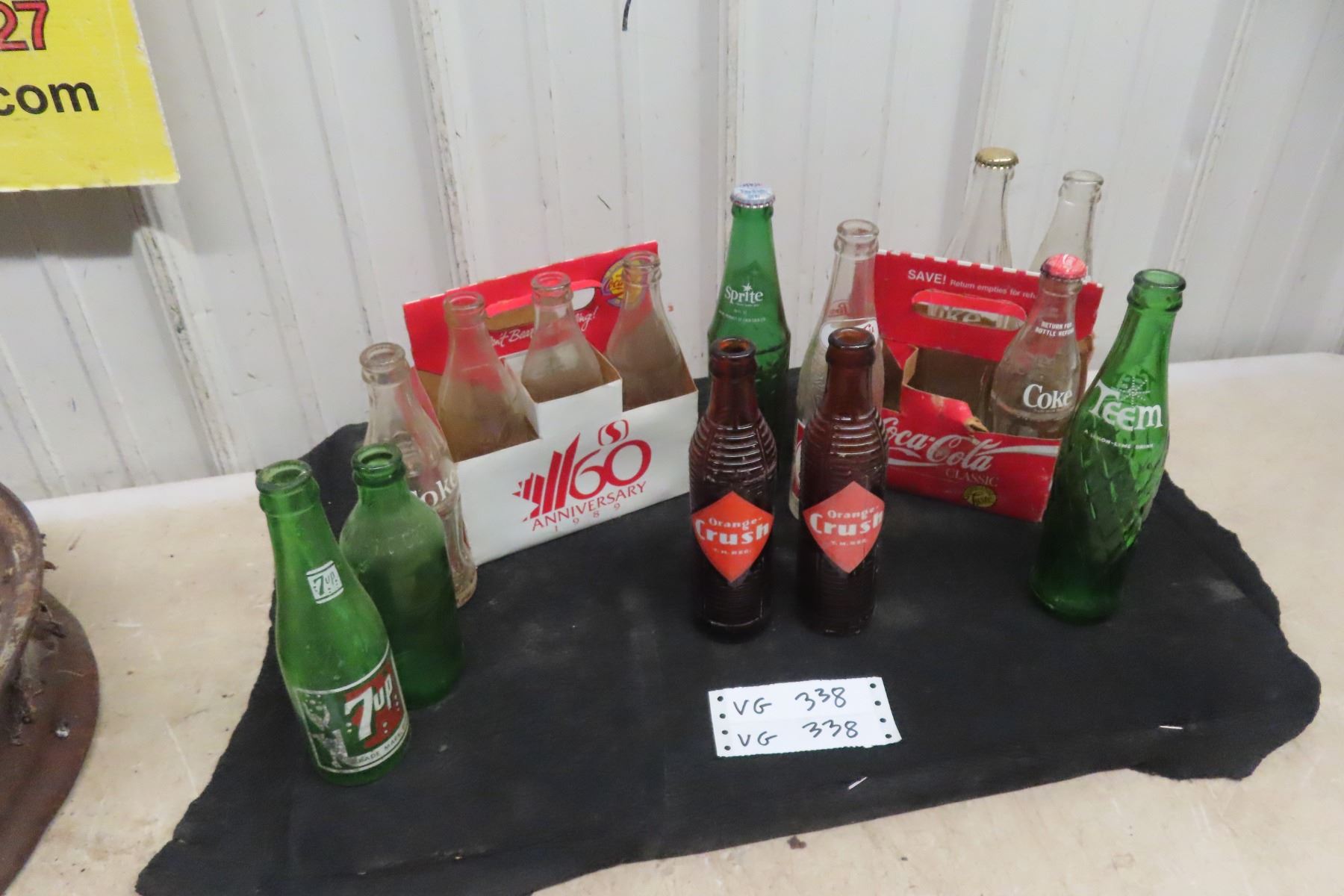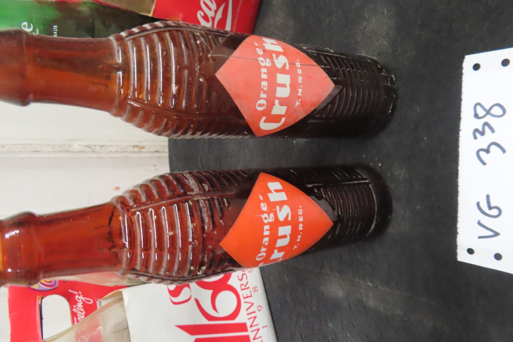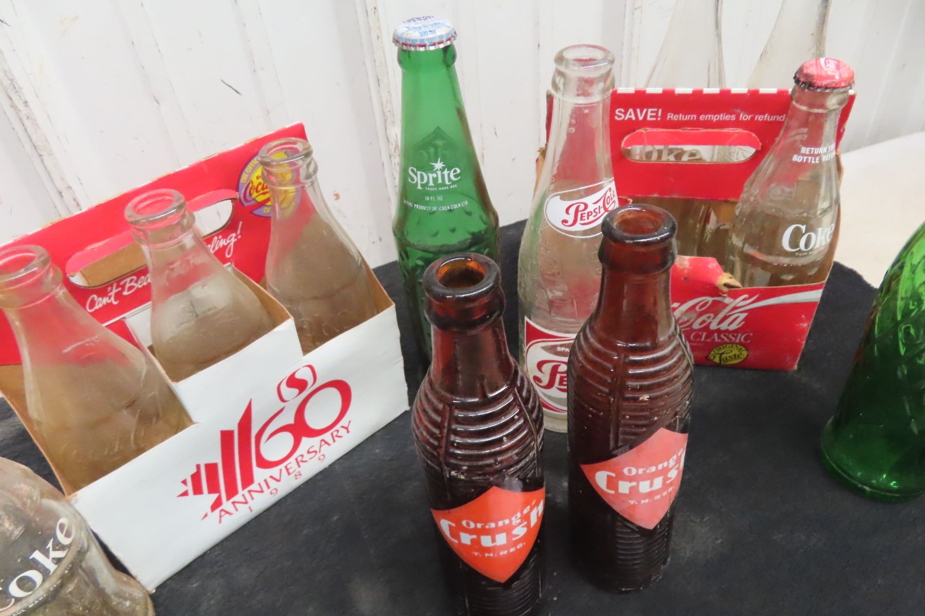 Old Pop Bottles with 2 Carriers, Orange Crush, Coca Cola, 7 Up +