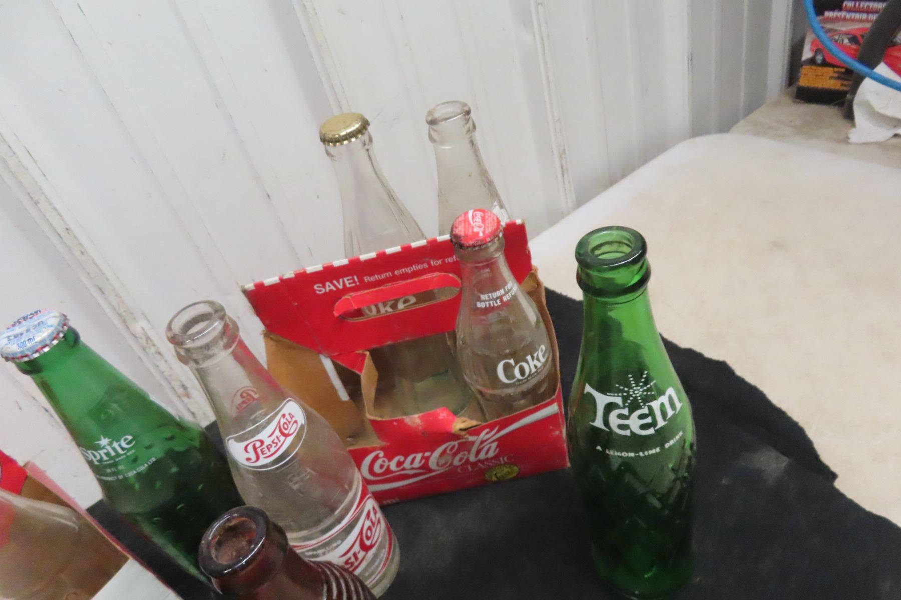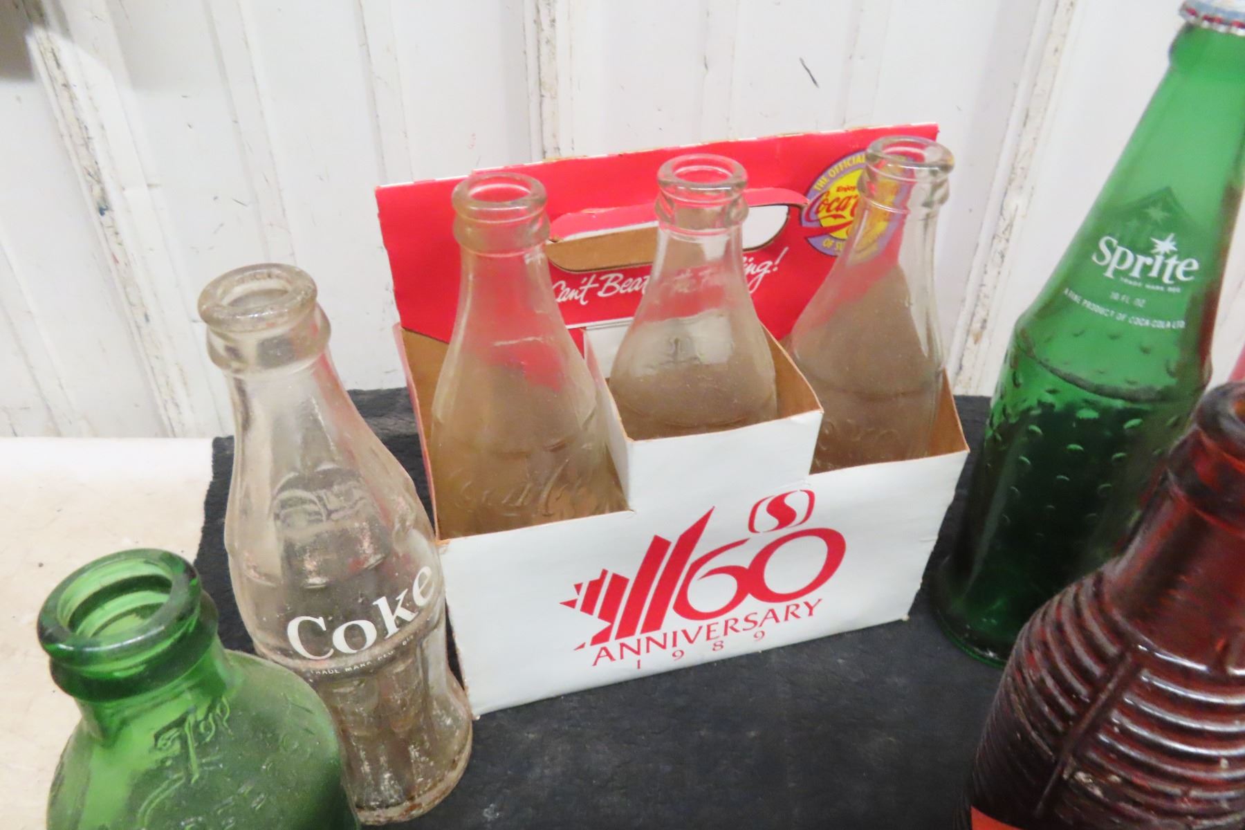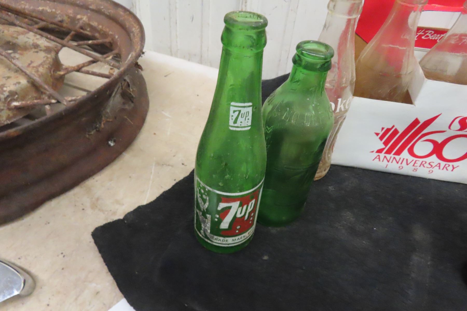 Old Pop Bottles with 2 Carriers, Orange Crush, Coca Cola, 7 Up +