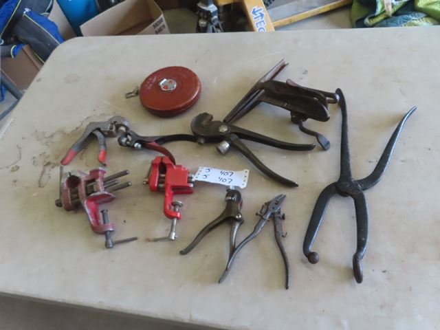 Old Tools, 2 Small Vices, Saw Setters, Vice, Tape Measure plus more