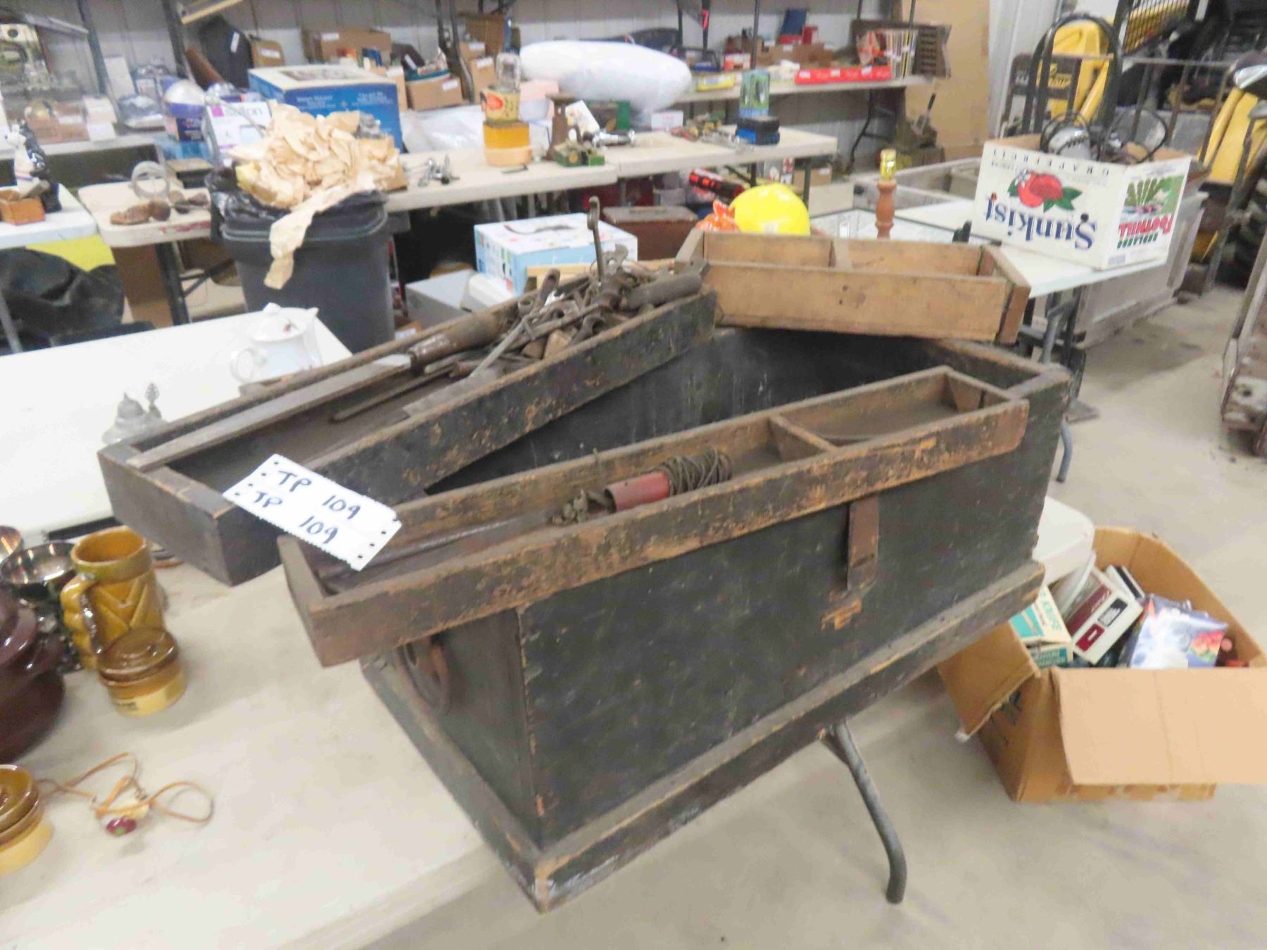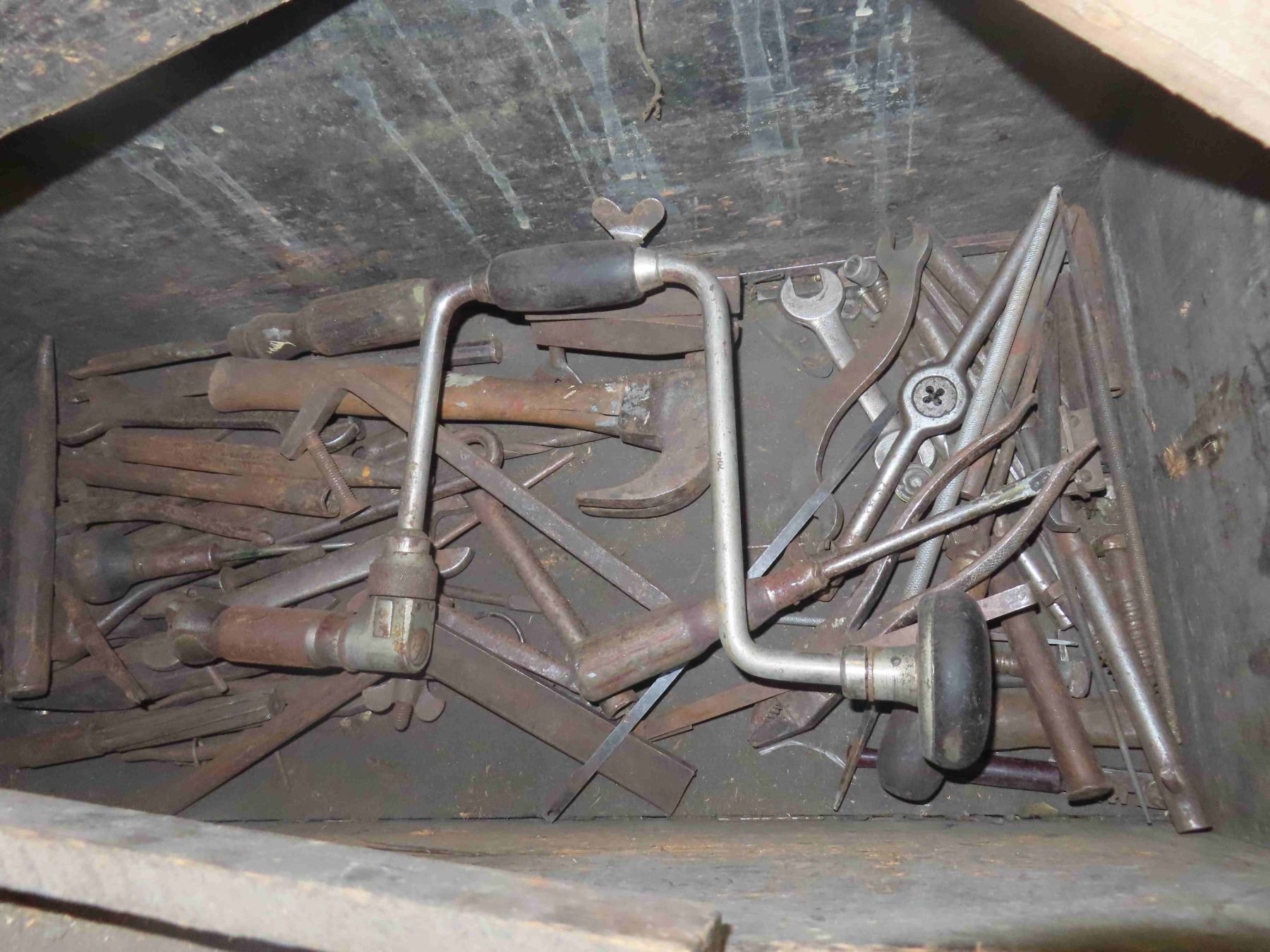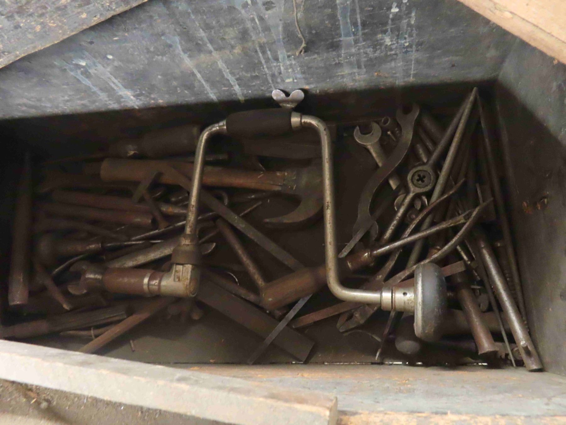 Old Wooden Carpenters Box 13" x 14"x26" with Tools ; Brass Bits, Hole Punch,
