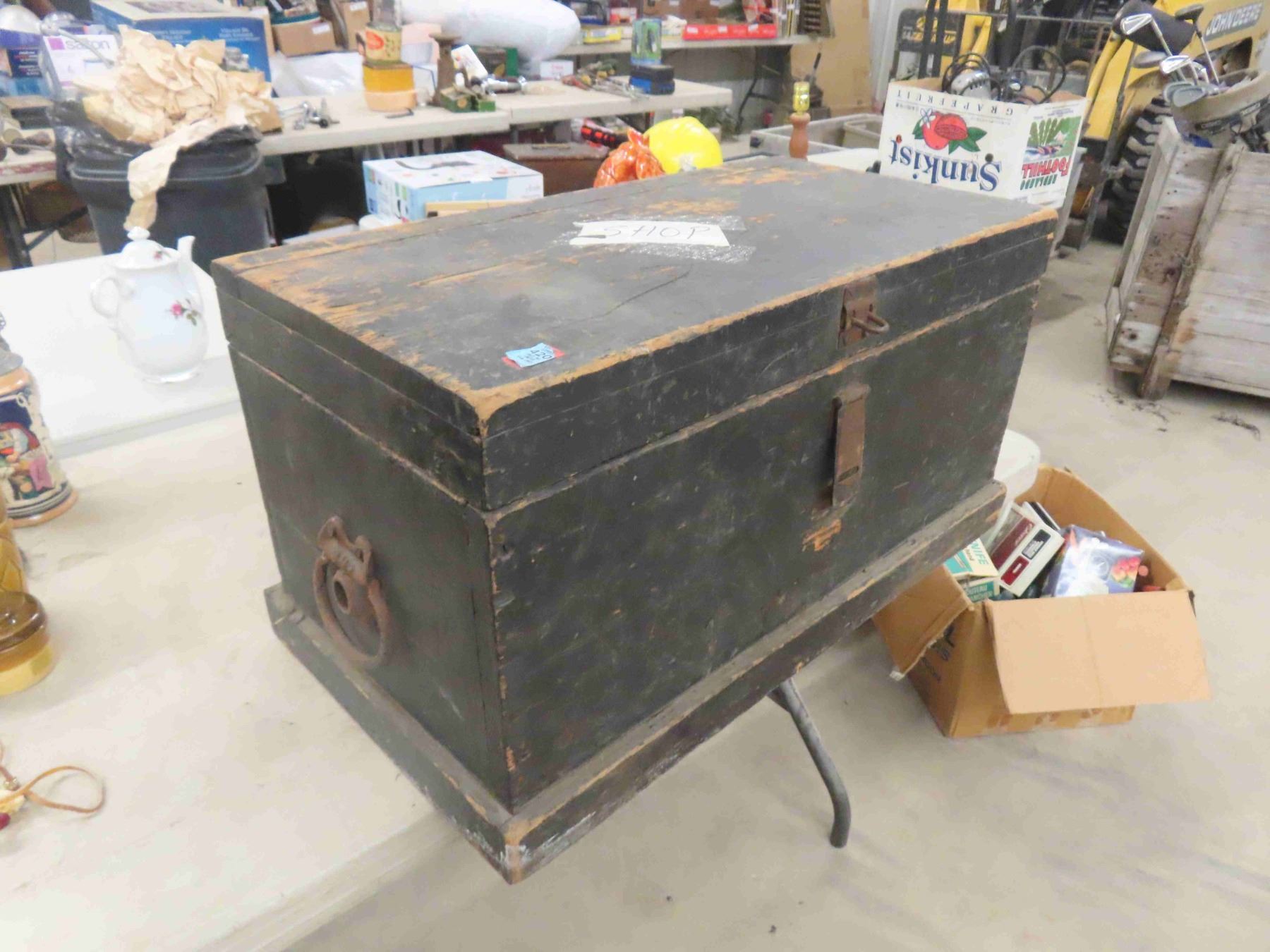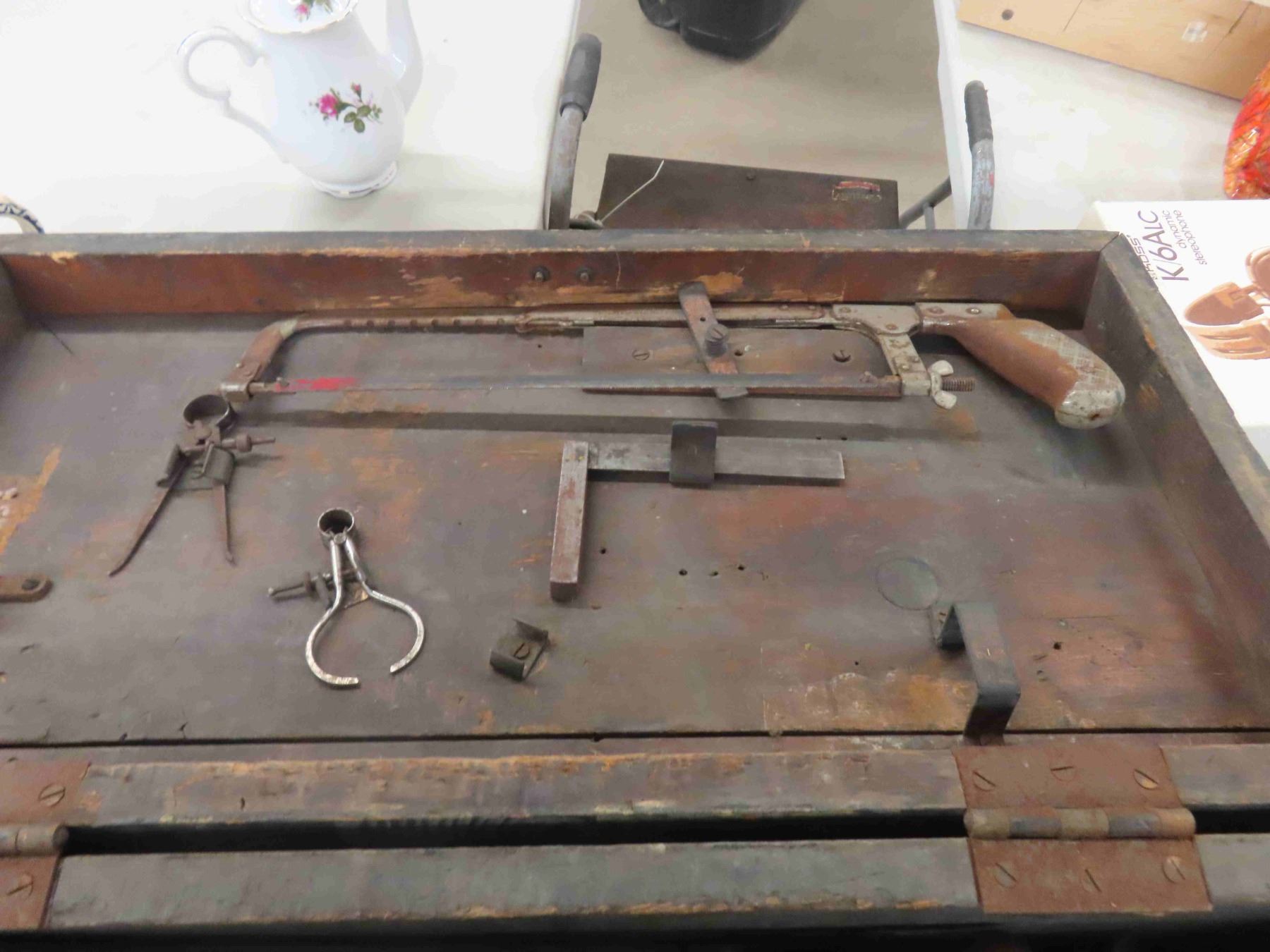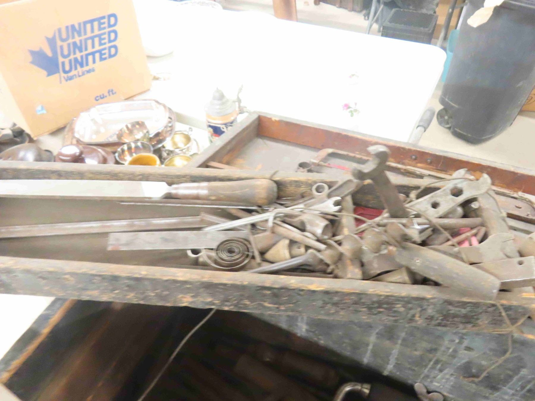 Old Wooden Carpenters Box 13" x 14"x26" with Tools ; Brass Bits, Hole Punch, Tap + Die Set, Hammer, Wrench, Files, Plus more