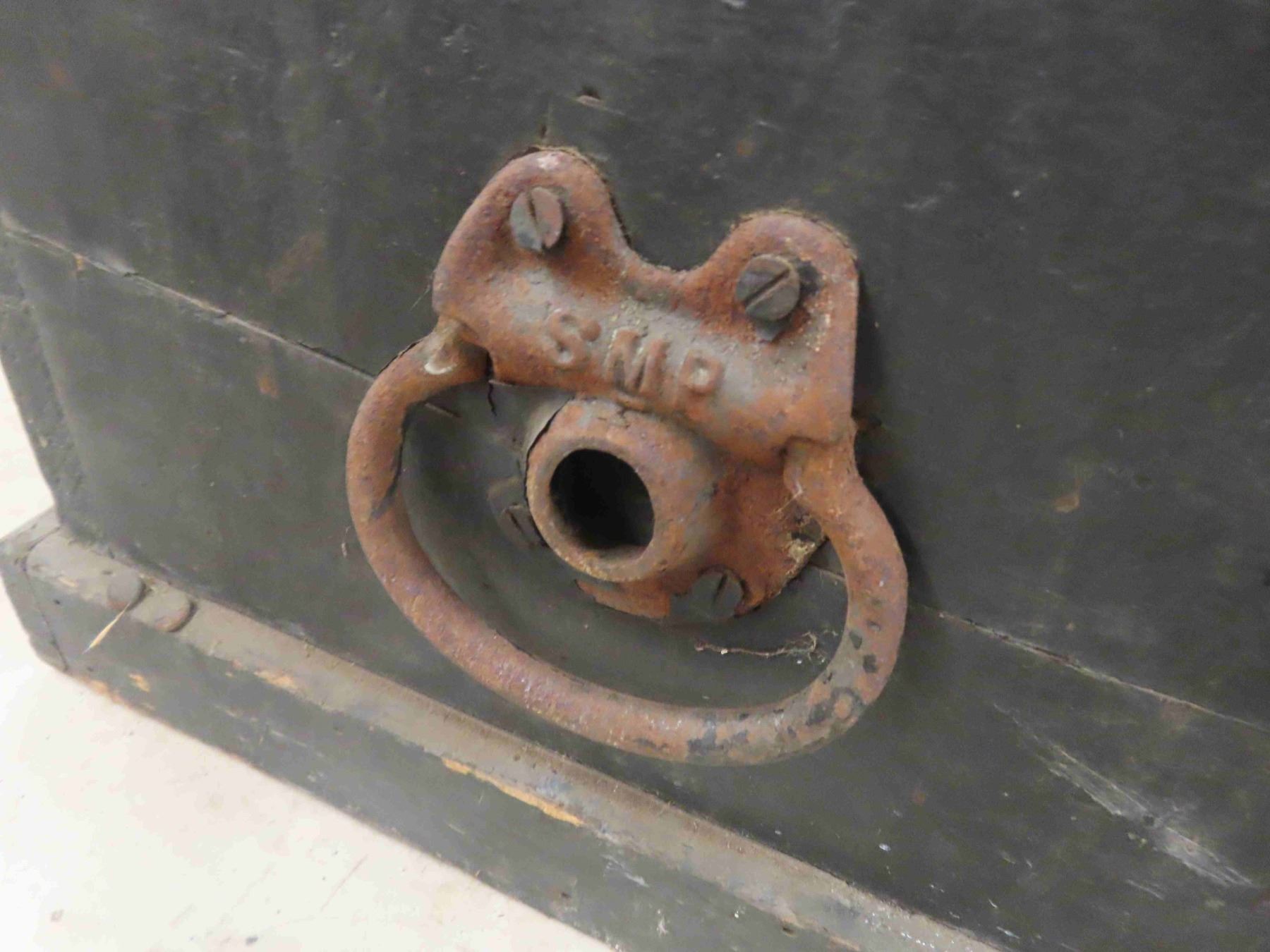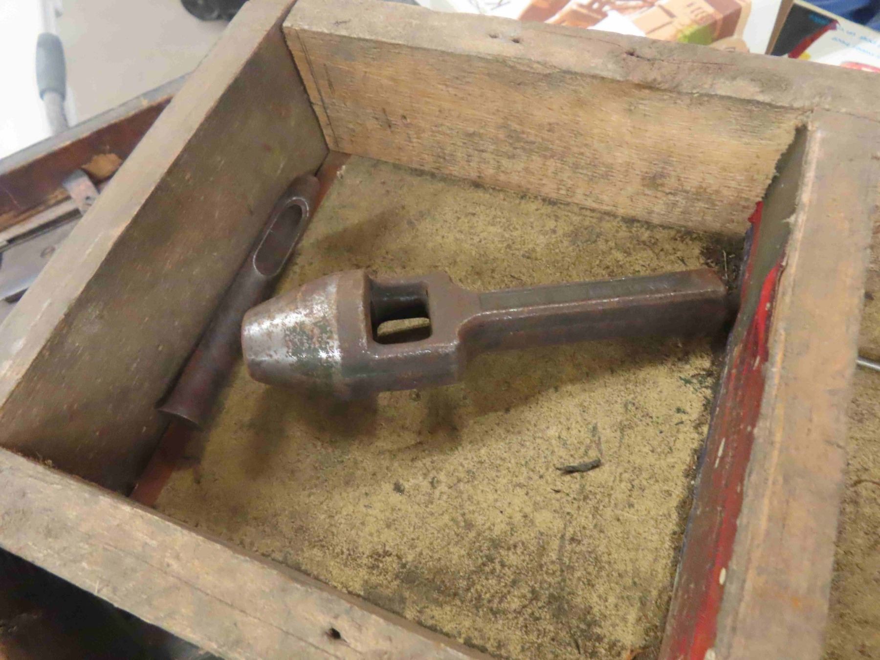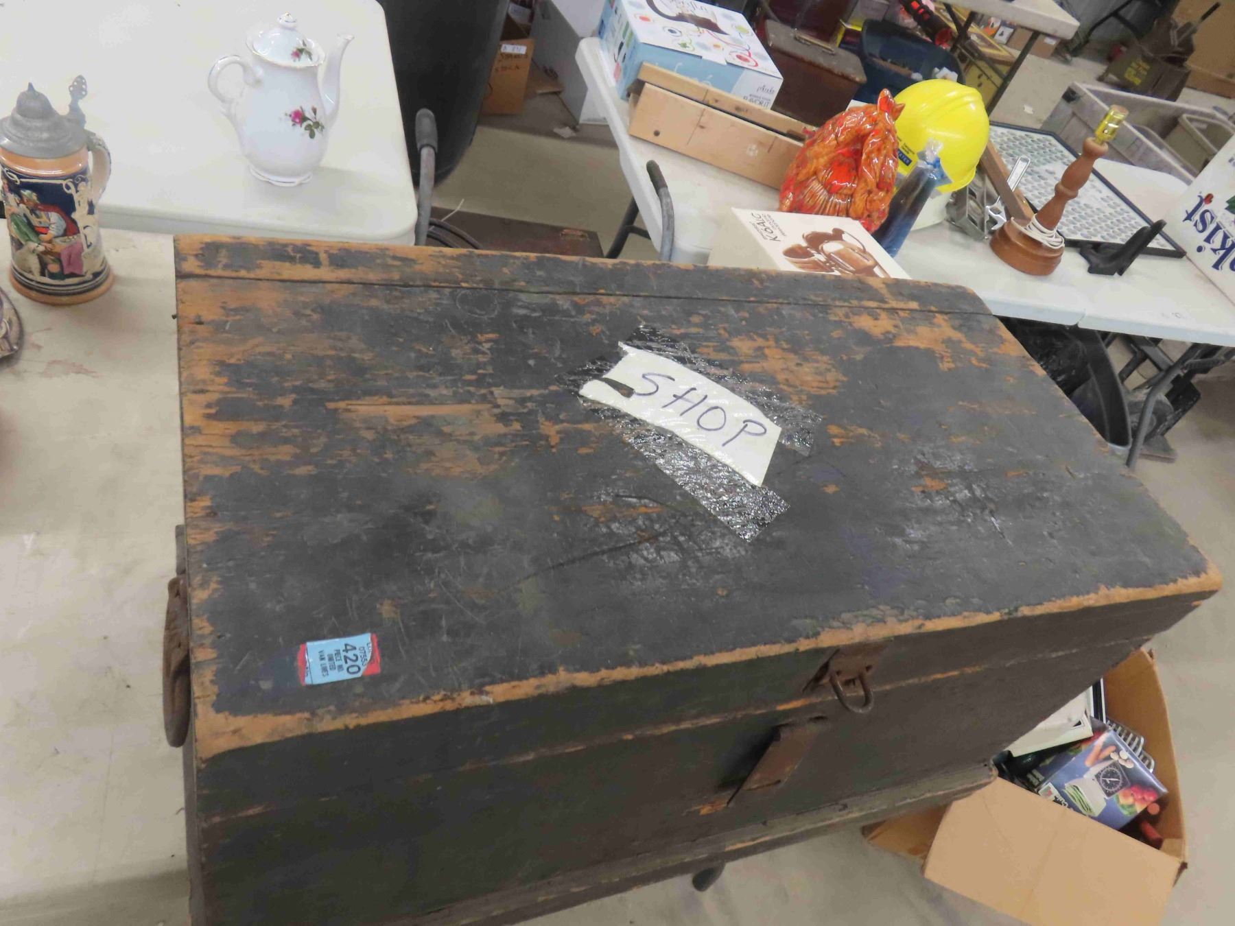 Old Wooden Carpenters Box 13" x 14"x26" with Tools ; Brass Bits, Hole Punch, Tap + Die Set, Hammer, Wrench, Files, Plus more