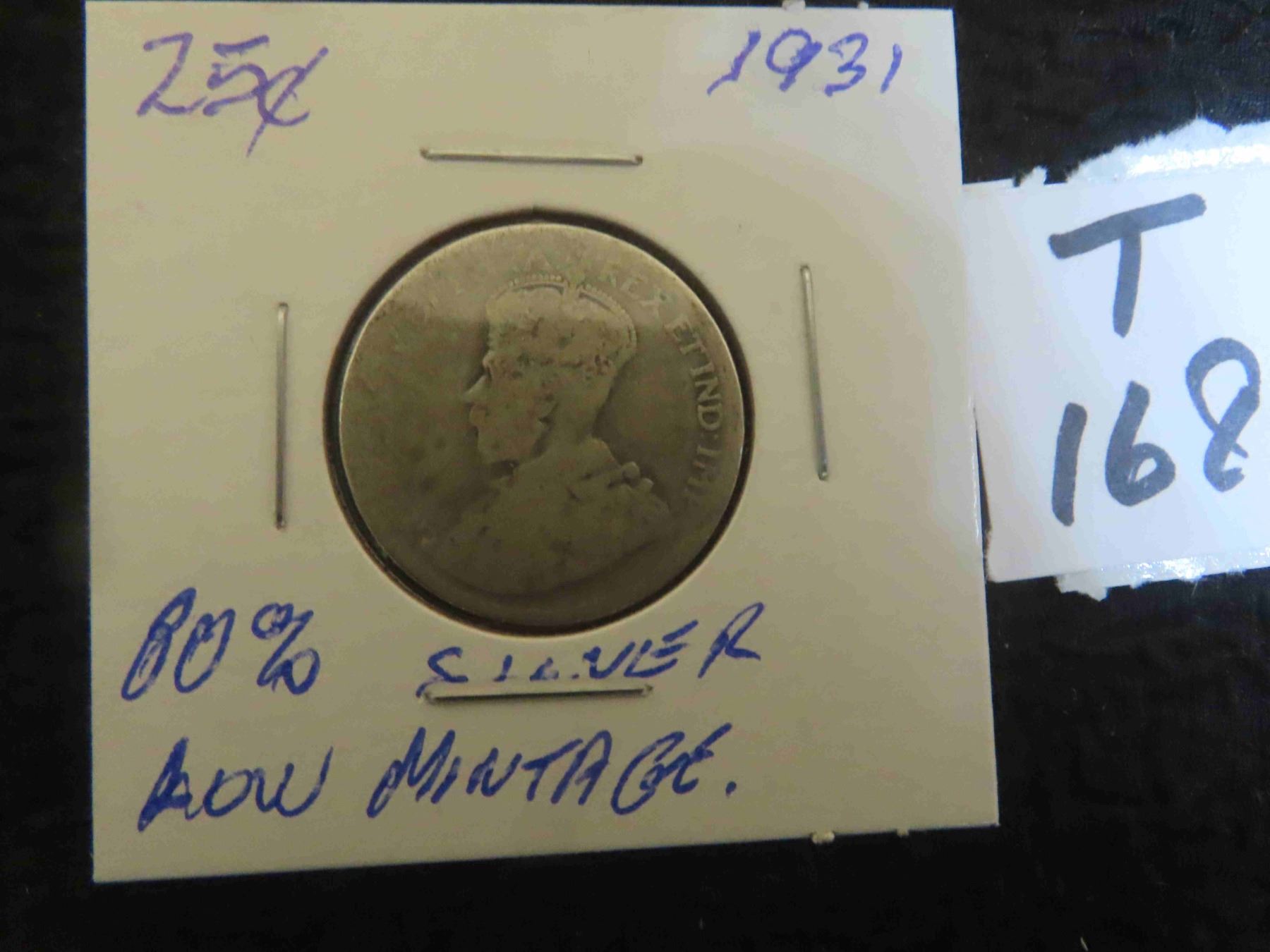 One 1931 Canadian 80% silver 25 cent coin, circulated, ungraded, low mintage year