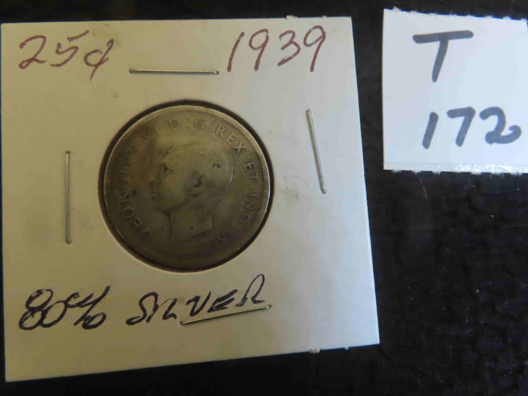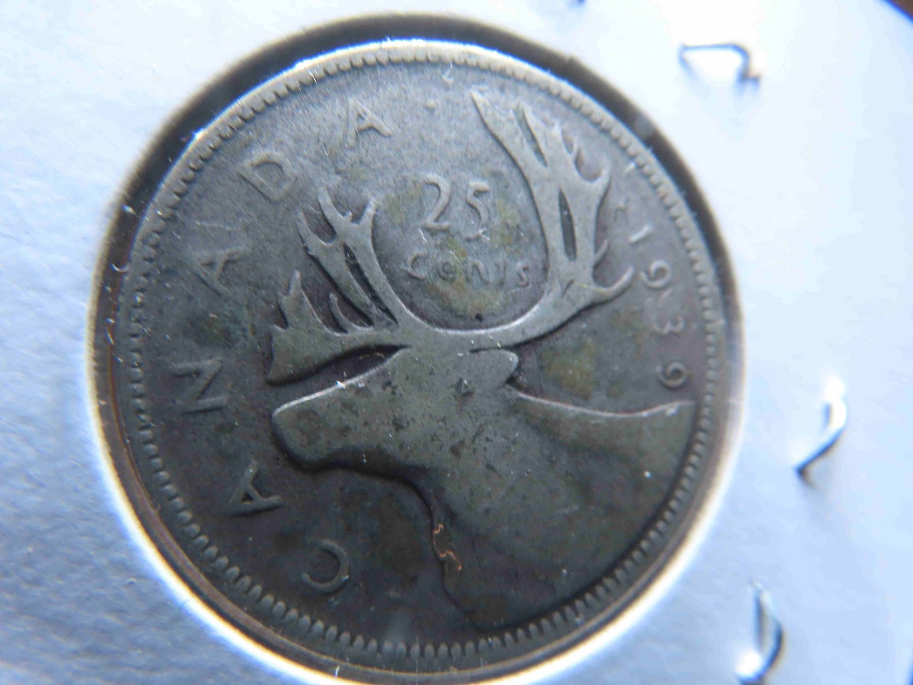 One 1939 Canadian 80% silver 25 cent coin, circulated, ungraded.