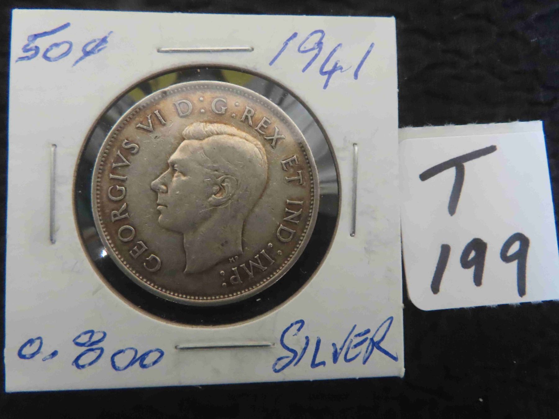 One 1941 Canadian 80% silver 50 cent coin, circulated, ungraded. Die rotation 10-15 degrees