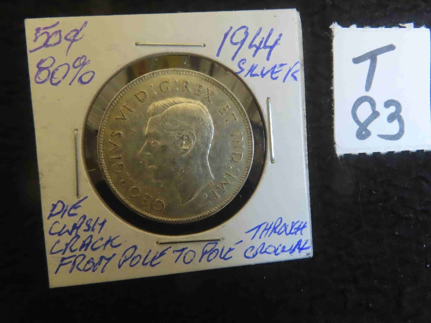 One 1944 Canadian 50 cent piece, 80% silver, long die clash-crack from pole to pole following upper arch of crown, circulated and ungraded
