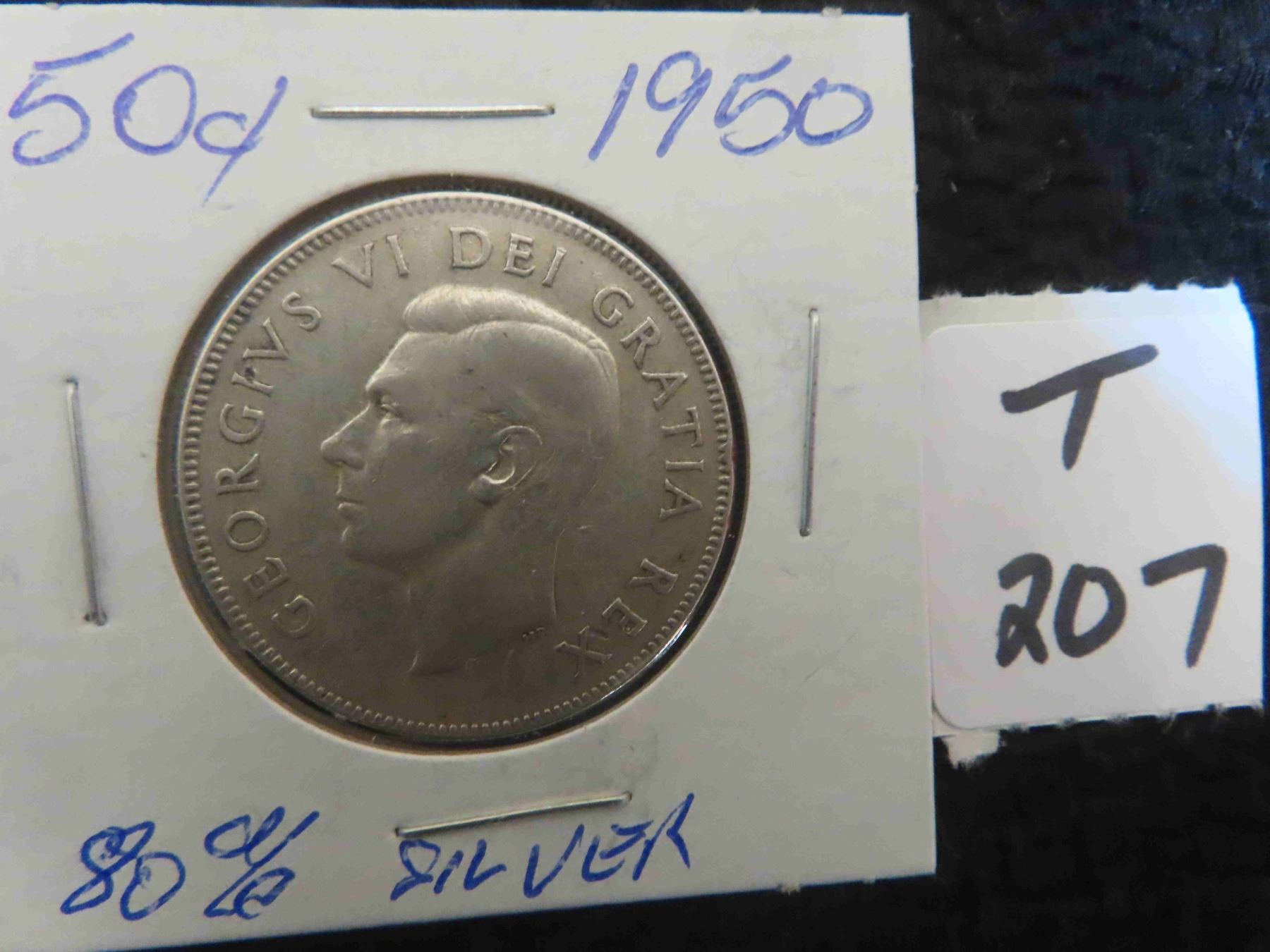 One 1950 Canadian 80% silver 50 cent coin, circulated ungraded.