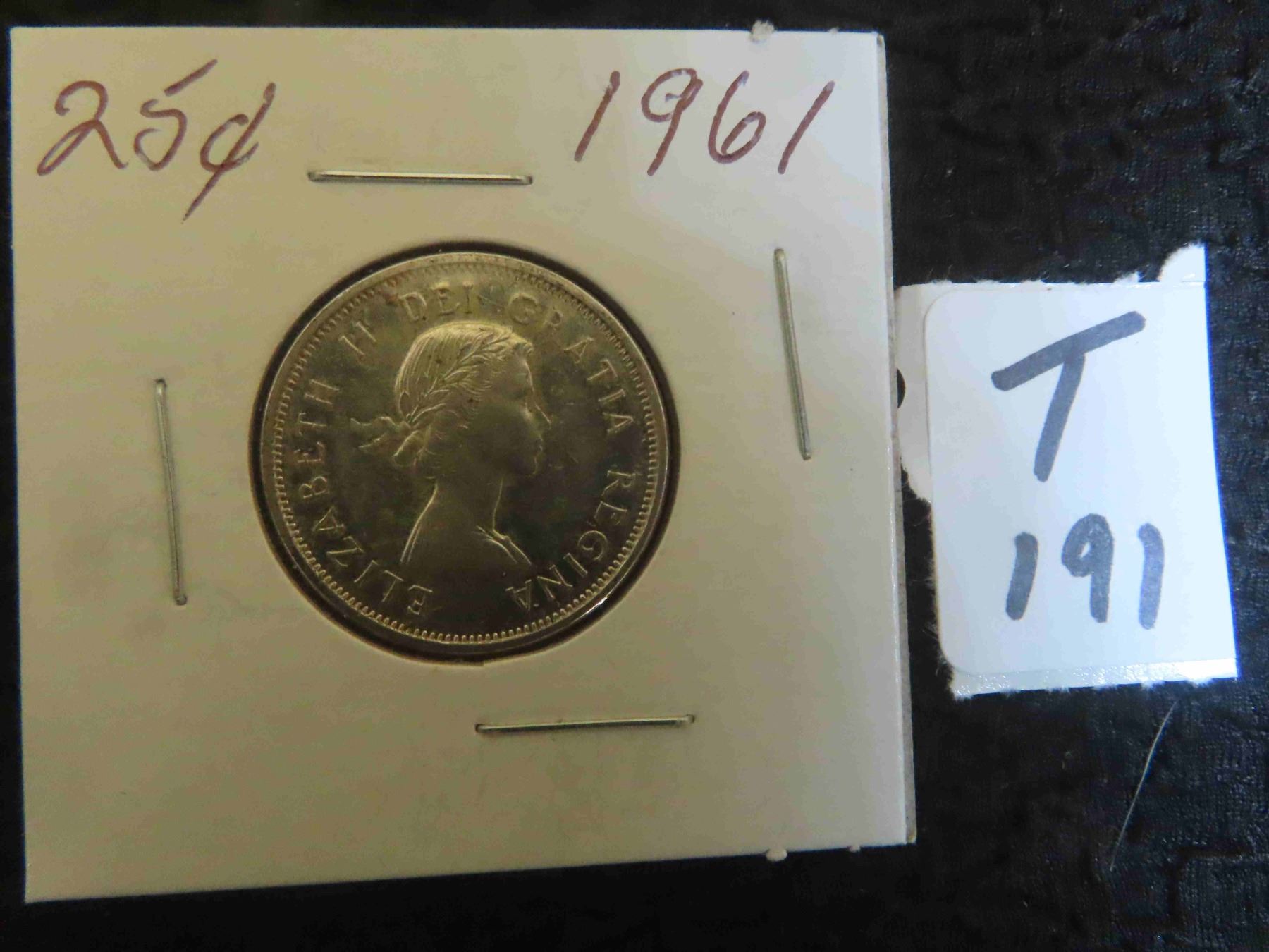 One 1961 Canadian 80% silver 25 cent coin, circulated, ungraded.