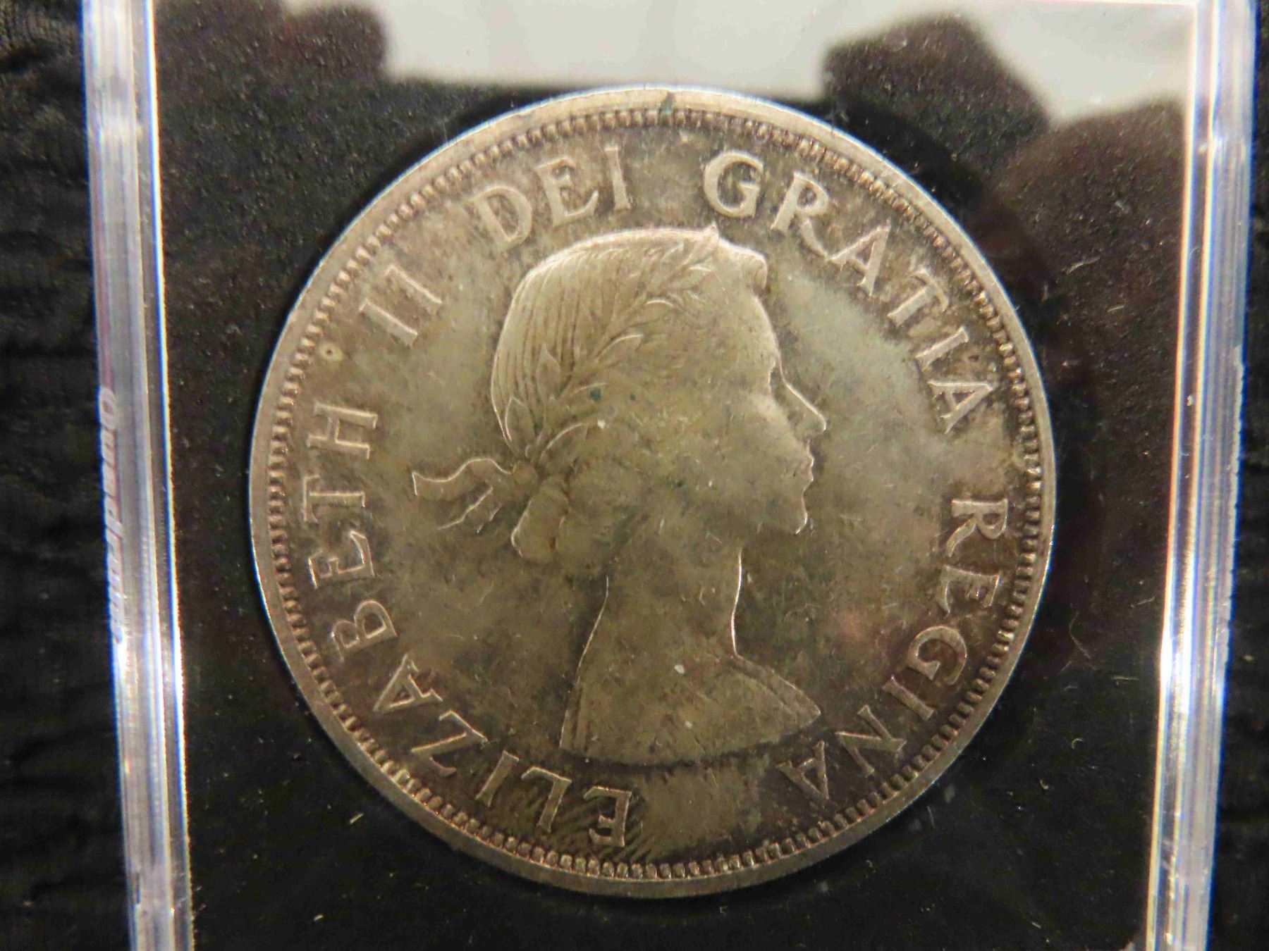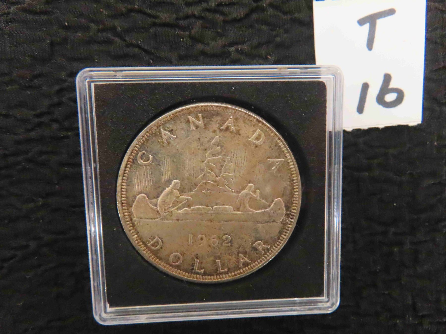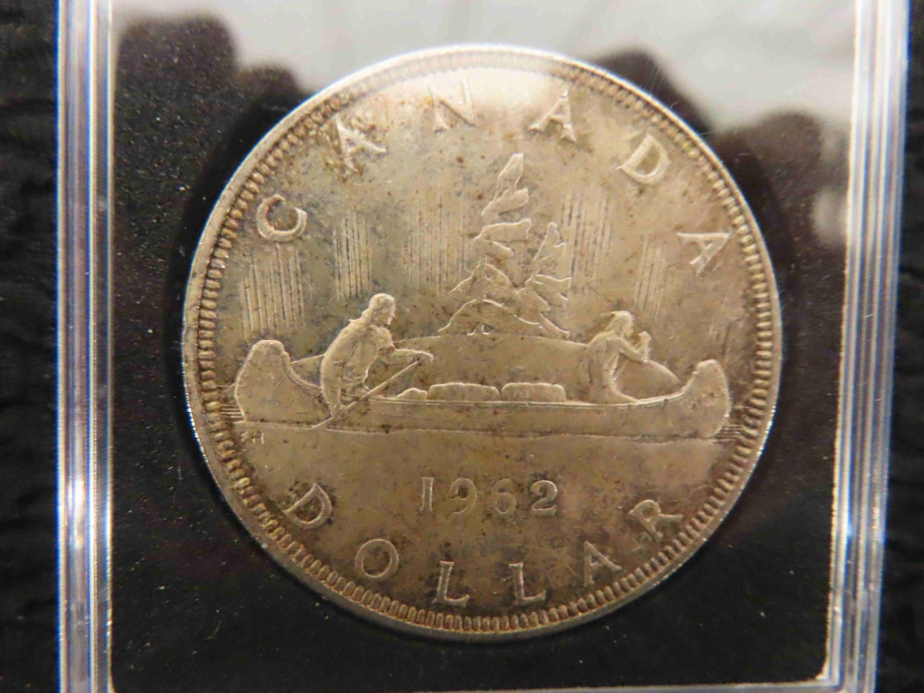 One 1962 Canadian 80% Silver Dollar, sealed in case. heavier toning around rim of obverse, light even toning on reverse, ungraded