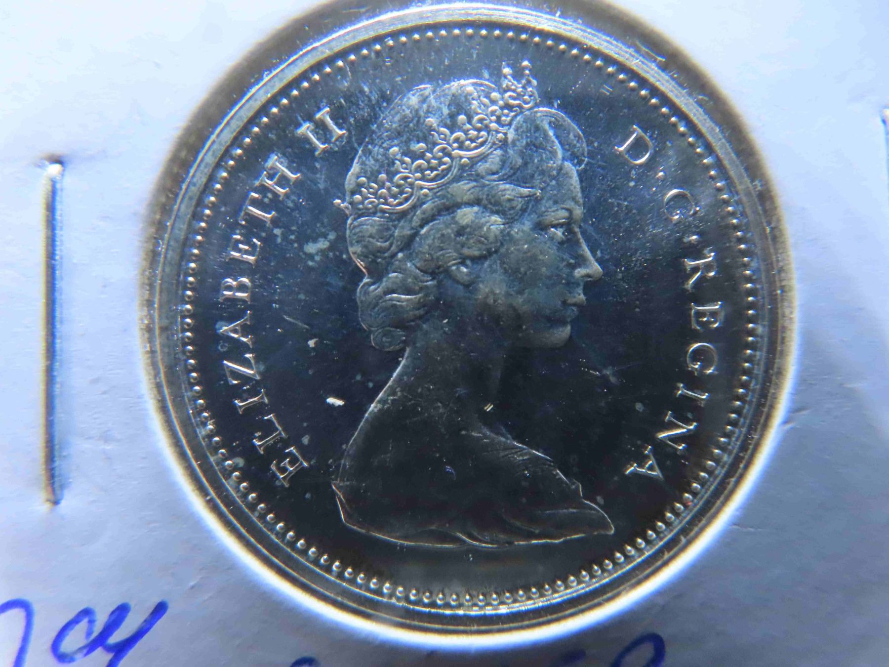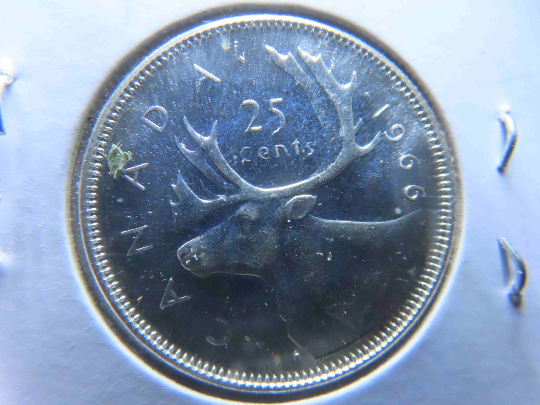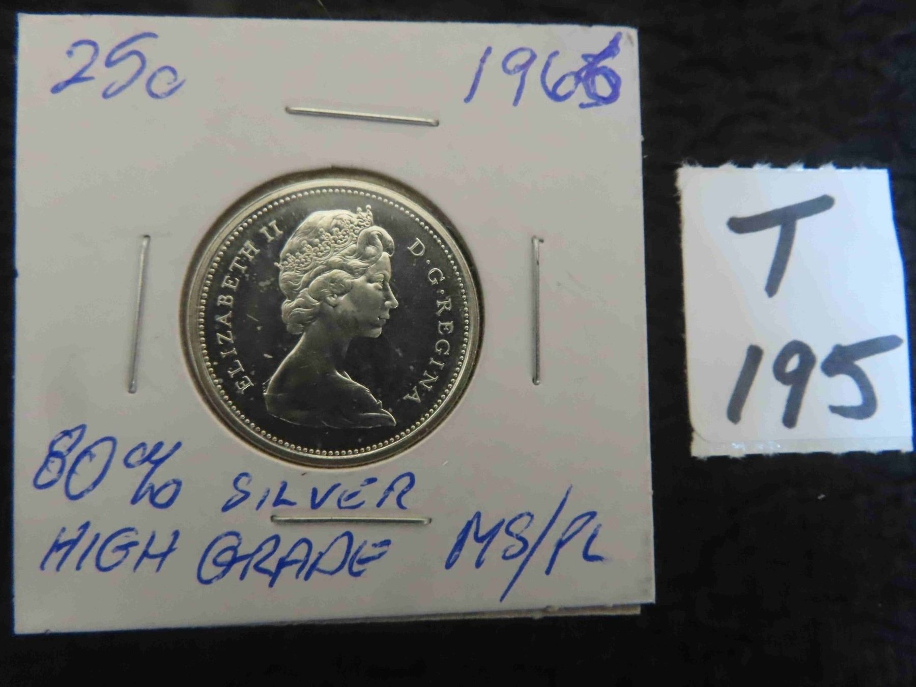 One 1965 Canadian 80% silver 25 cent coin, circulated, ungraded. High grade MS/PL