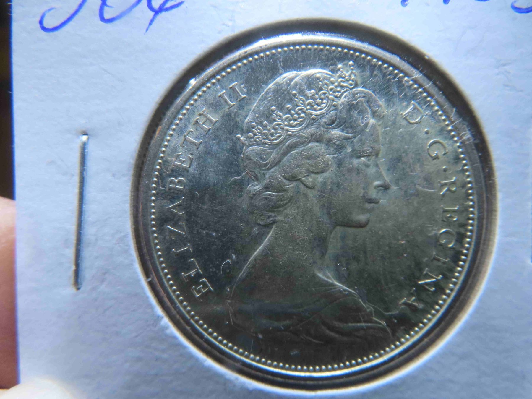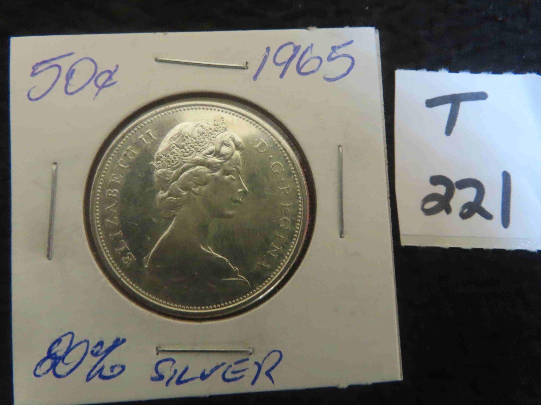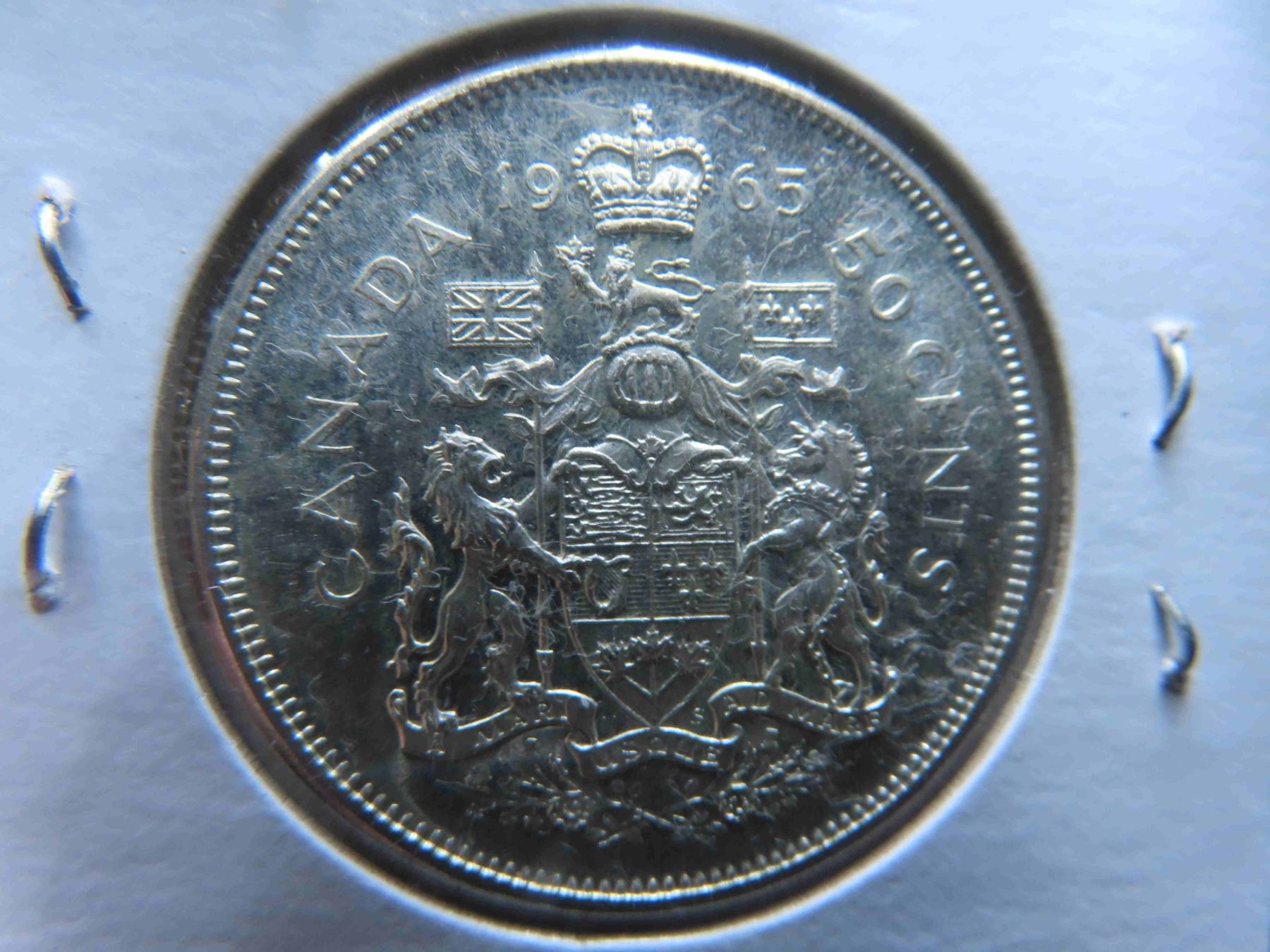 One 1965 Canadian 80% silver 50 cent coin, circulated ungraded. Nice coin