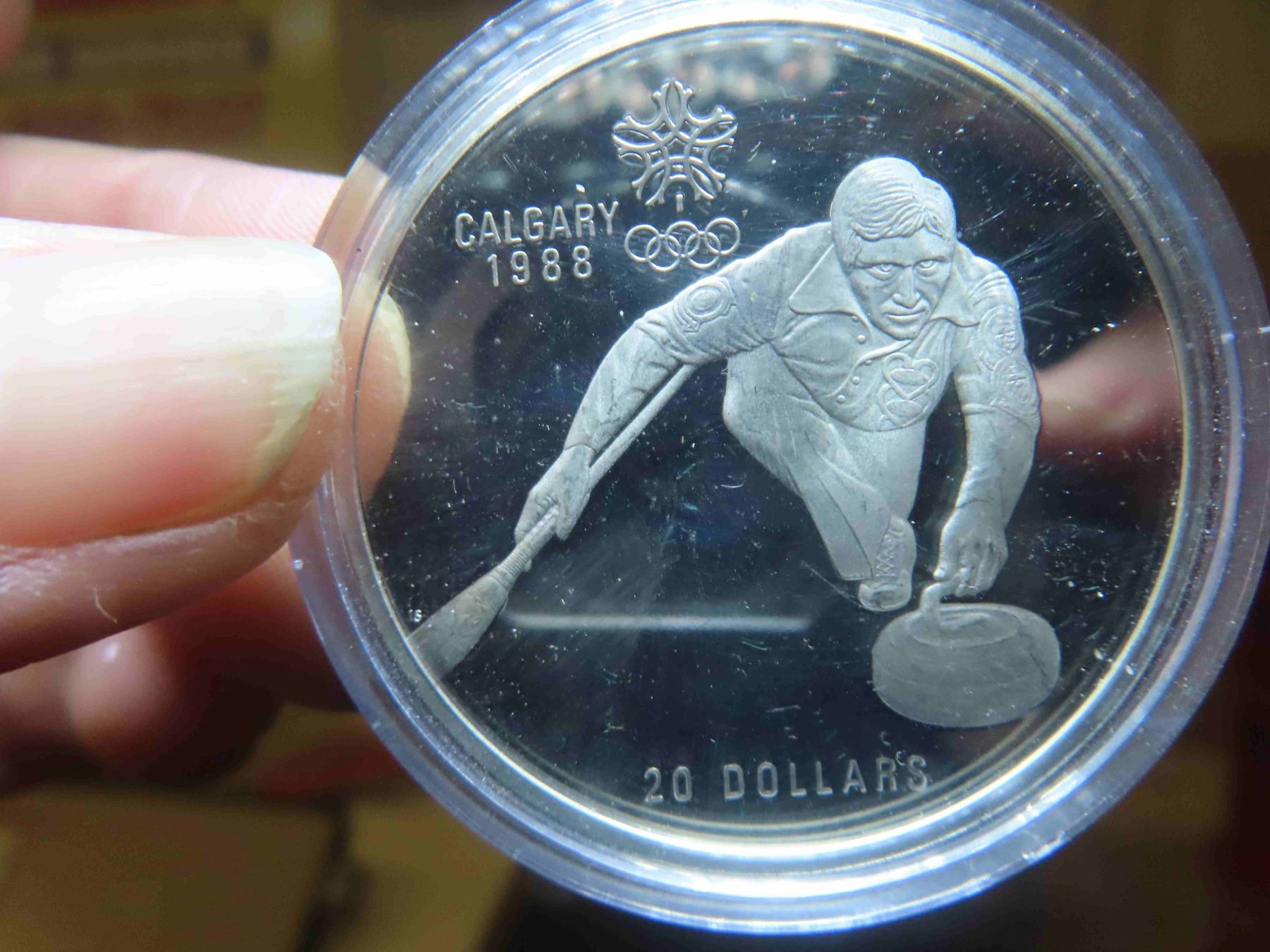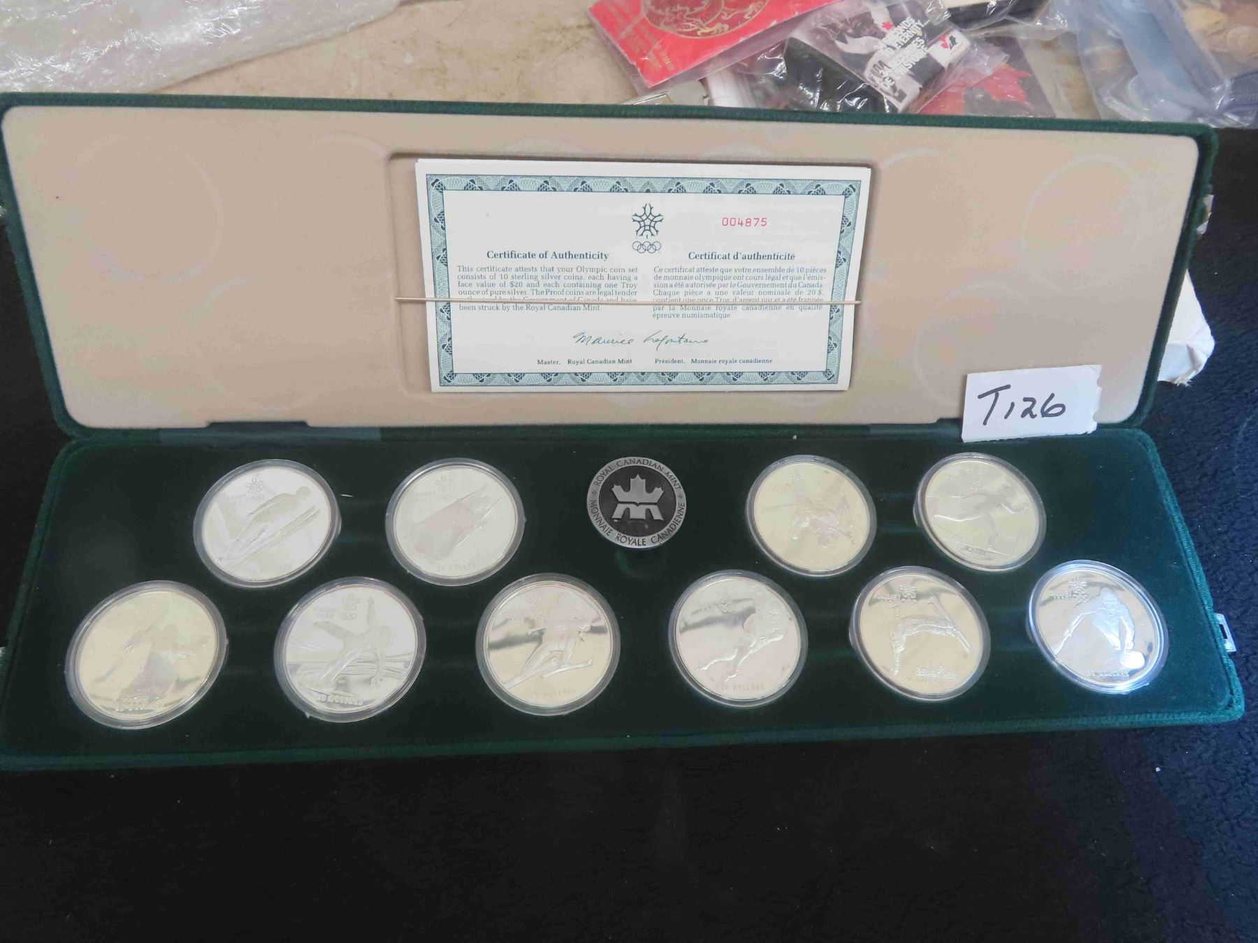 One Complete set of 10; 1988 Calgary Olympic $20 Silver bullion coins in green velvet case, Gem Proofs, (34.107gms of 92.5% sterling Silver; equates to one troy ounce of pure silver) sealed in capsules with certificates of authenticity, and have never been touched, any visible marks are on the capsules, not on the coins.