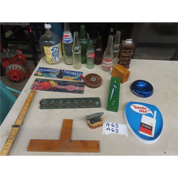63 - Vintage Coke & Pepsi Bottles, Crush, Wyonola, Apple Cider, Glass Ashtray, Metal Ashtray, Vintage SchMcSherry Auction Service Ltd.