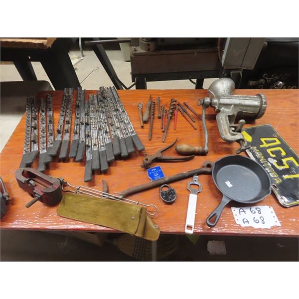 68 - Vinage Tools, Socket Holders, Vice, Cast Iron Frying Pan, Old LIcense Plates, Dominion Grinder Plus McSherry Auction Service Ltd.