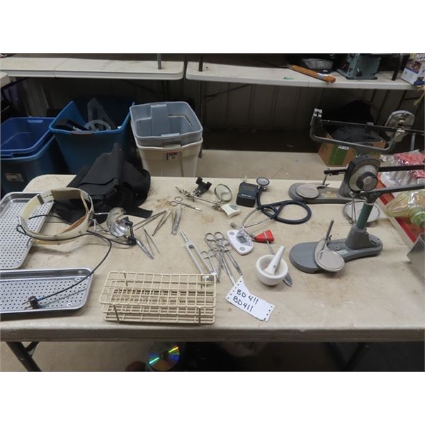 421 - (BD) Medical Implements , Stethescope, Headlight, Reflex Checker, Tweezers, 2 Scales Plus More!McSherry Auction Service Ltd.