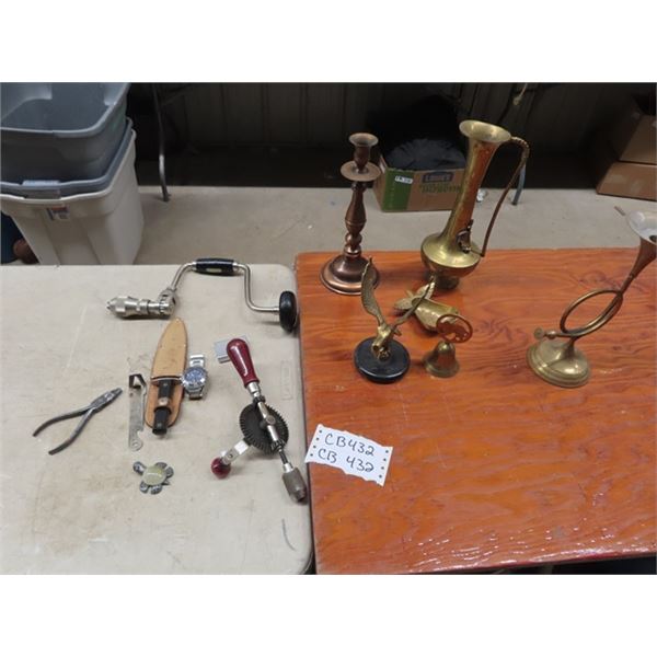 432 - Brass Hems, Candle Holders, Pitcher, Brass Eagle Vintage Hand Mixer, Screwdriver, Knife, Zippo Plus McSherry Auction Service Ltd.
