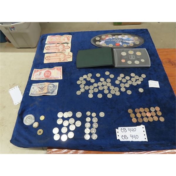 3 - $2 Bills, Millenium Quaters, Specimen Set, 50 Nickels, 18 Pennies, Winnipeg Airport Coin Tokens 1996 , 1 Trinidad, 20 Pesos
