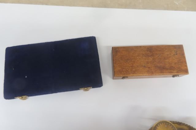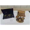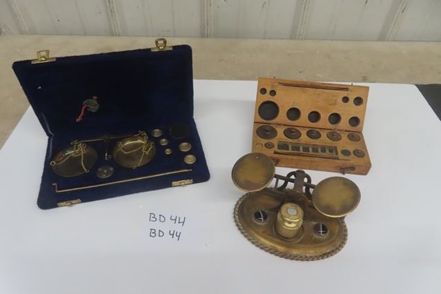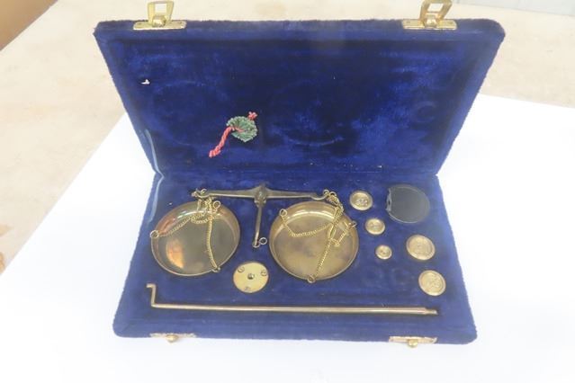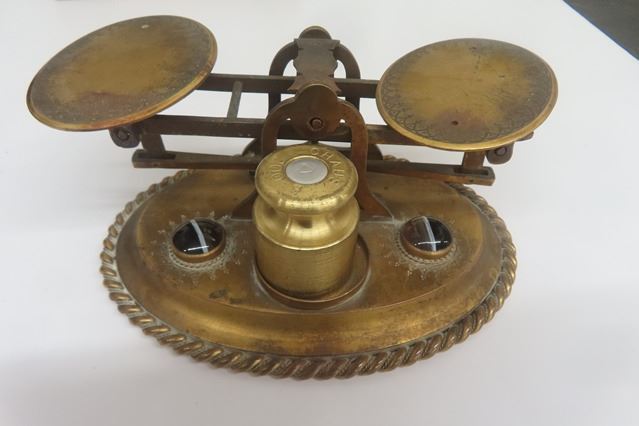 Outstanding Wood + Brass Ornate Postal Scale, Also Brass / Gold Pharmaceutical Scale & Antique Fitted Wood box with Brass Weights