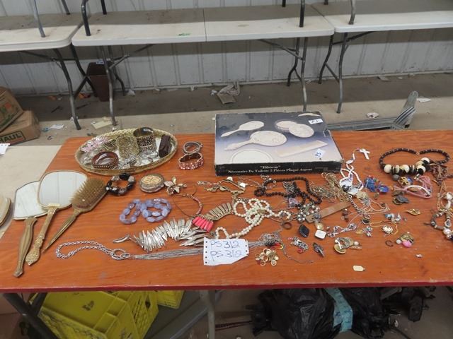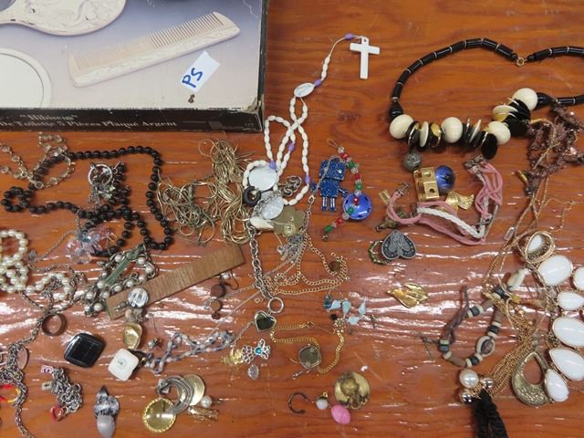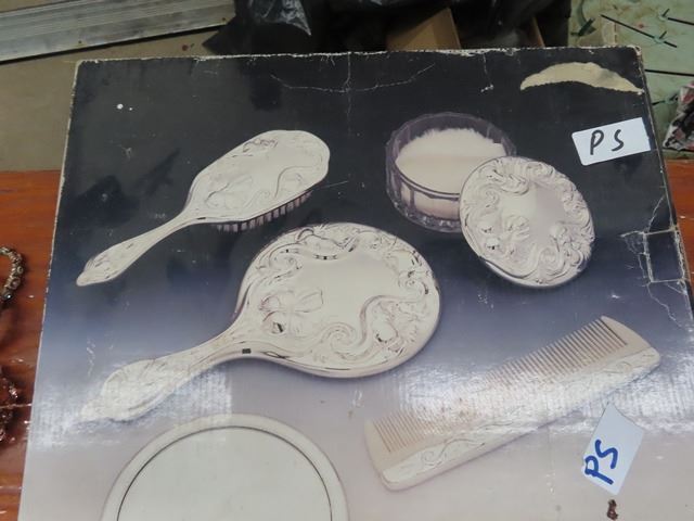 (PS) Vintage Brass Vanity Set in Box, Silver Vanity Set, Various Misc Costume Jewellery