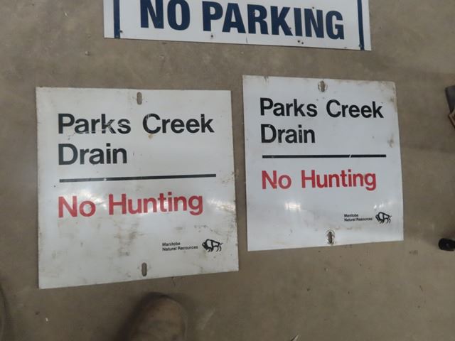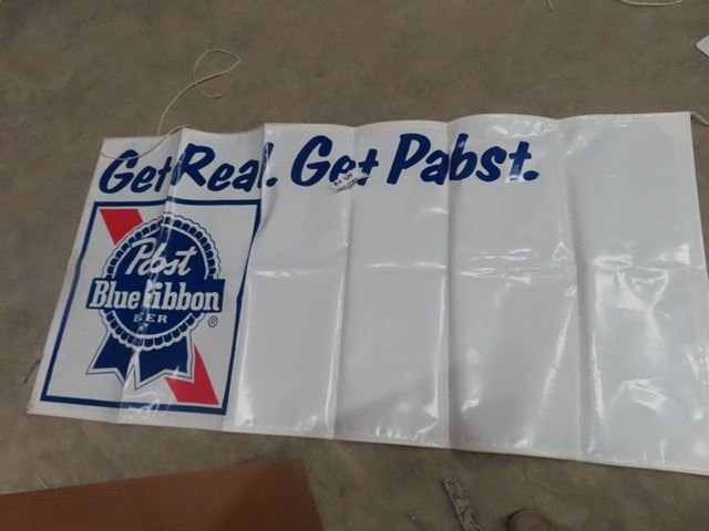Pabst Beer Banner 34"x 68" , Metal No Parking 12" x 24" & 2 Metal No Hunting Signs 15" x 15"