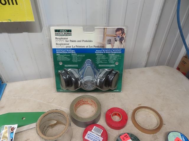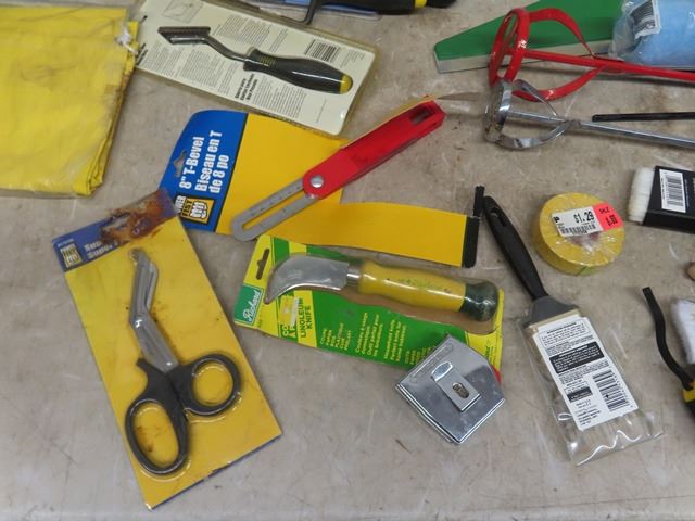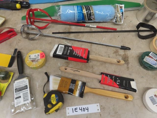 Paint Brushes, Misc. Tape, Scrapers, Respirator, Paint Mixers, Aprons, Small Tarp plus more - most new