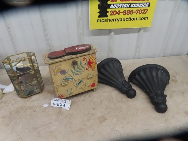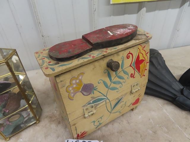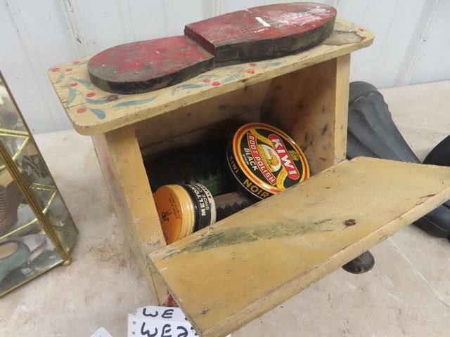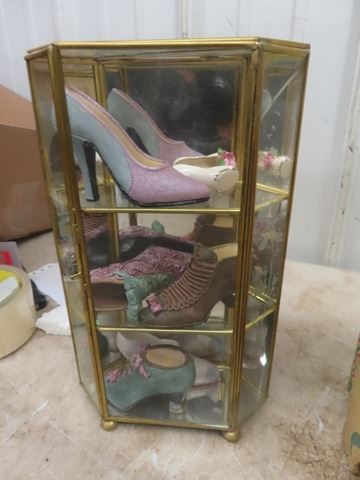 Painted Shoe Polish Kit, Brass & Glass Display w/ Shoe Ornaments plus 2 sconce shelves