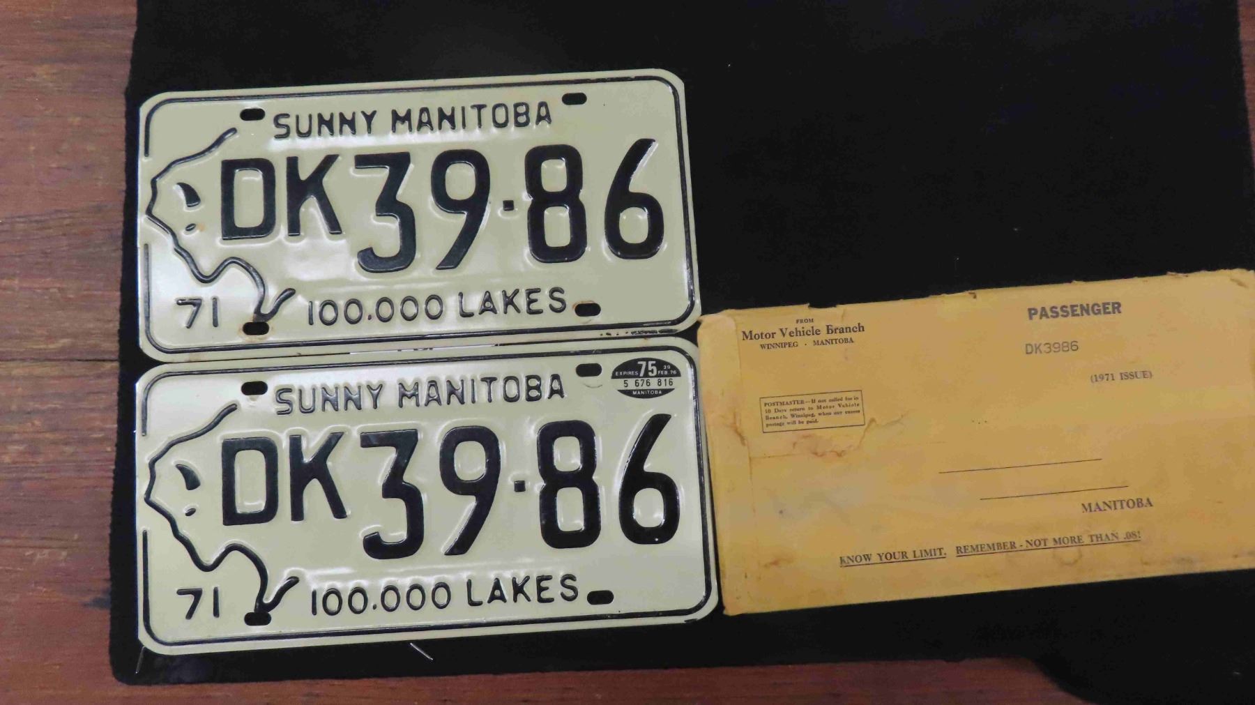 Pair of Manitoba 1958 License Plates, 1958 Minnesota Plate, Pair of 1971 Manitoba Plates in Their Original Envelope