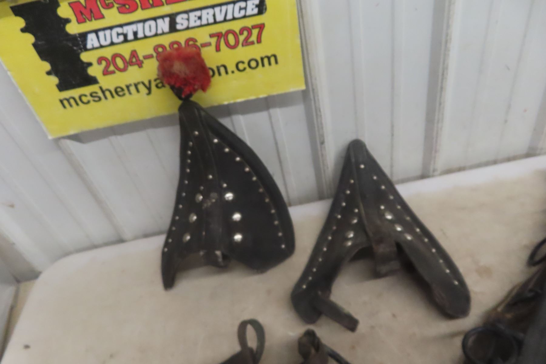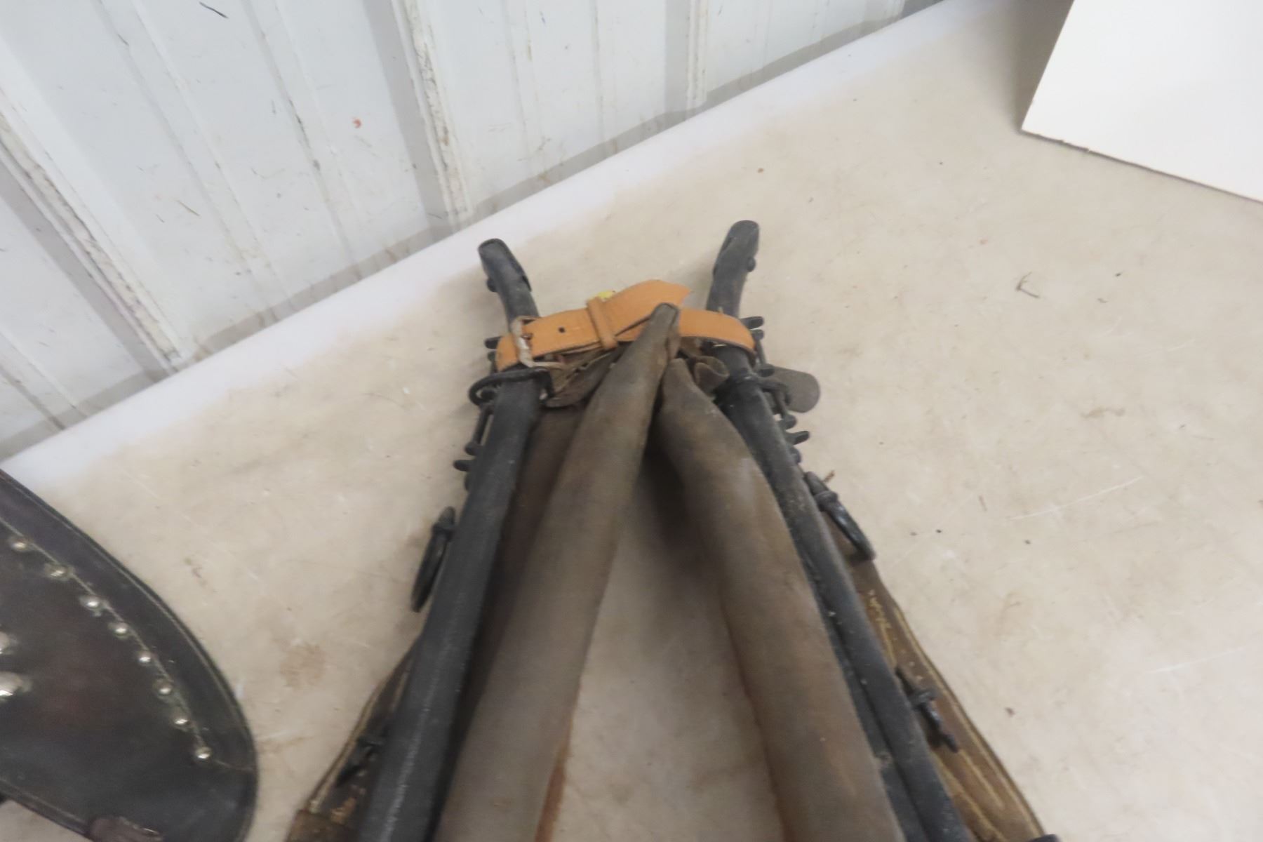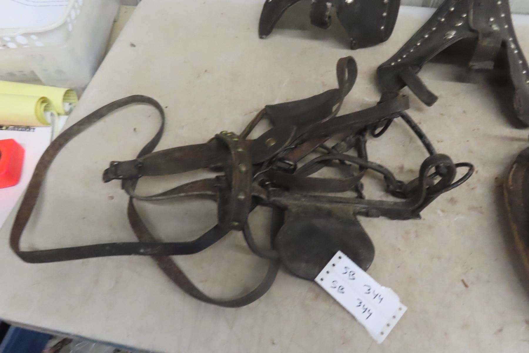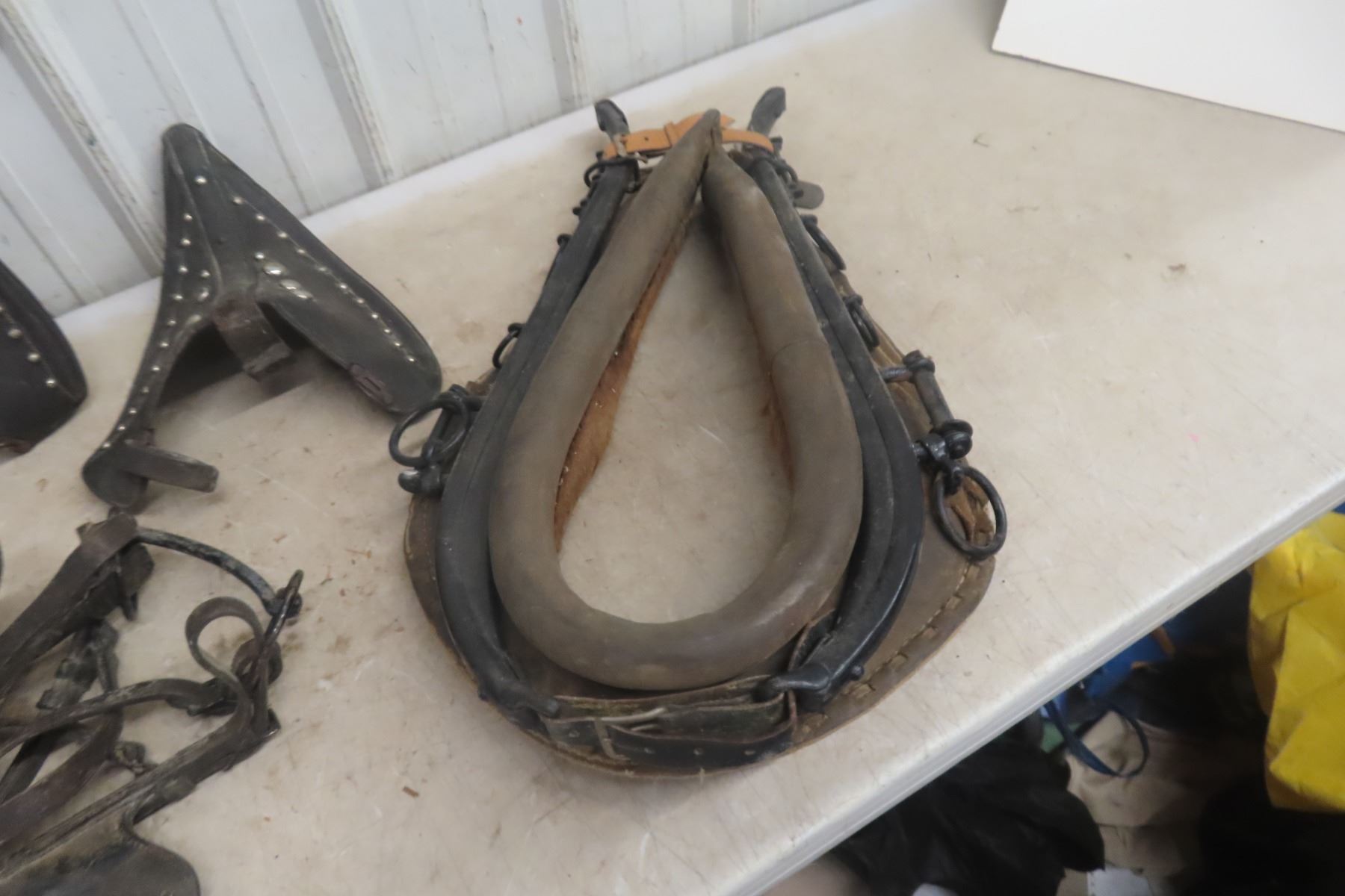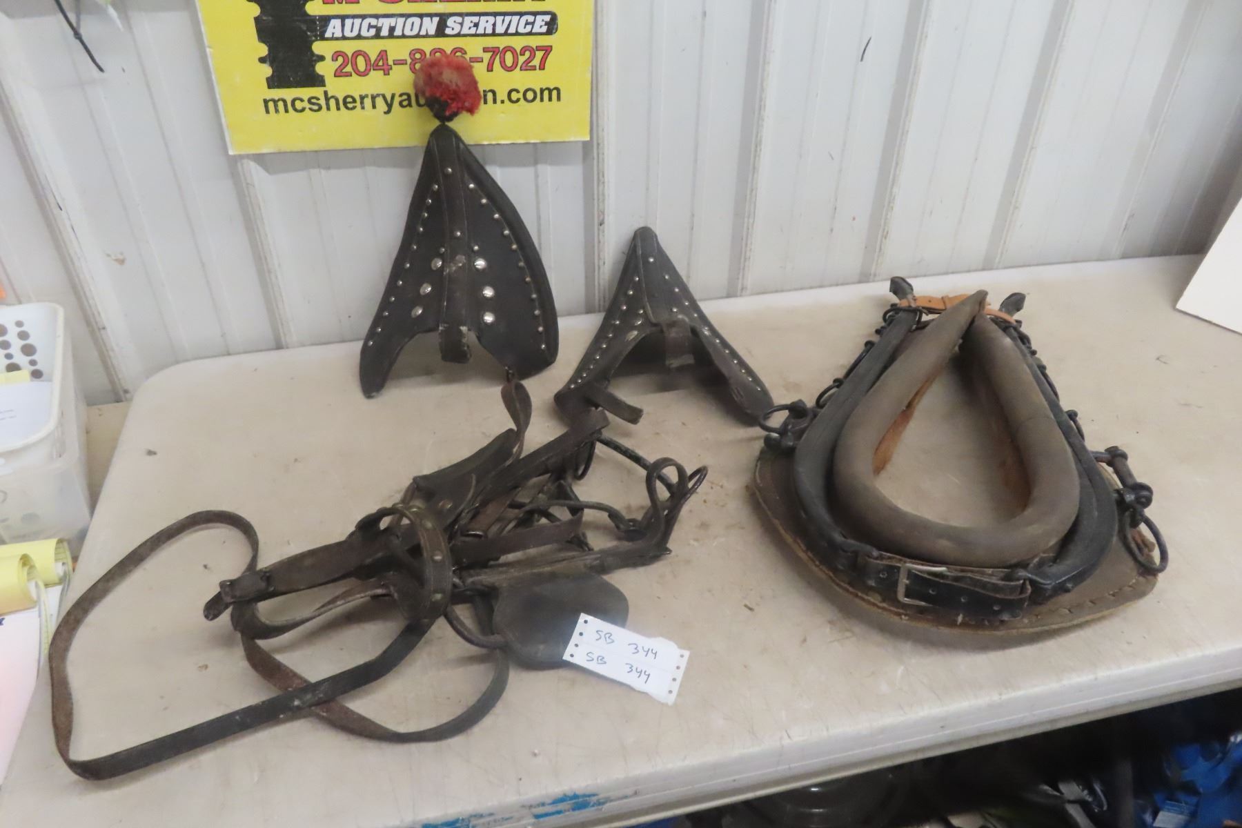 Pair of Scotch-Top Bridle Headpieces With Plume, Draft Horse Collar, and Bridle With Bit
