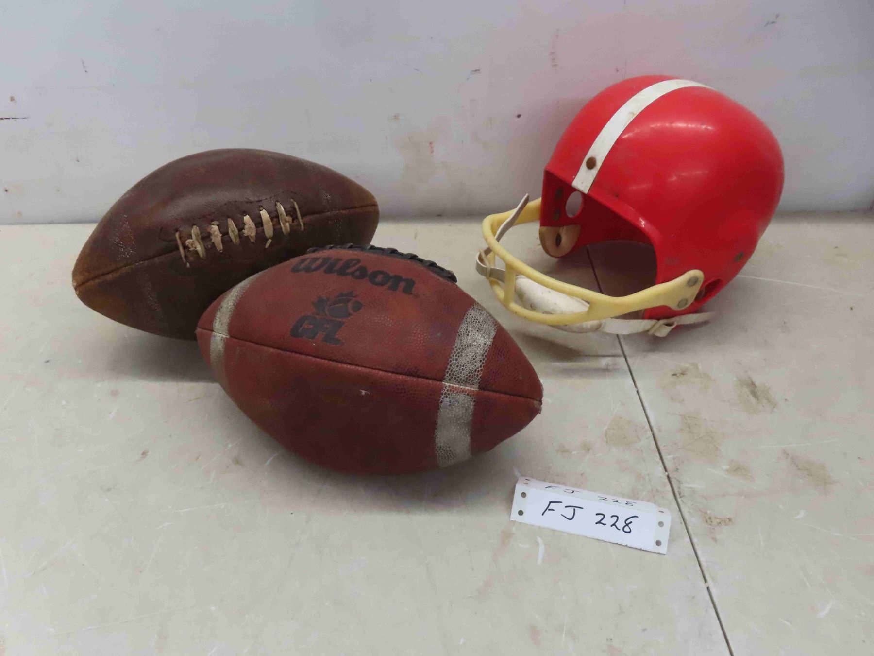 Pair of Vintage Leather Footballs , Wilson & Spalding, Youth School Helmet