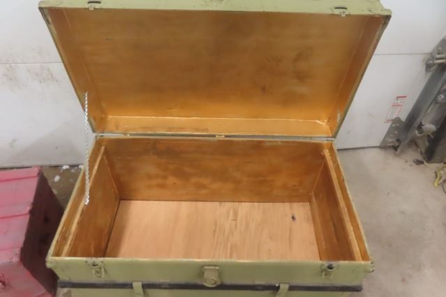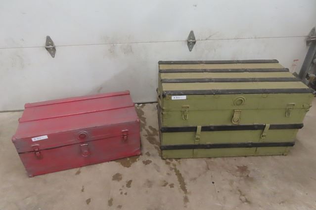 Pair of Vintage Travel Trunks - Both Have Been Lined with Wood + Painted Outside ; Small 13"x 16"x 31" + Lg 20"x 22"x 38"