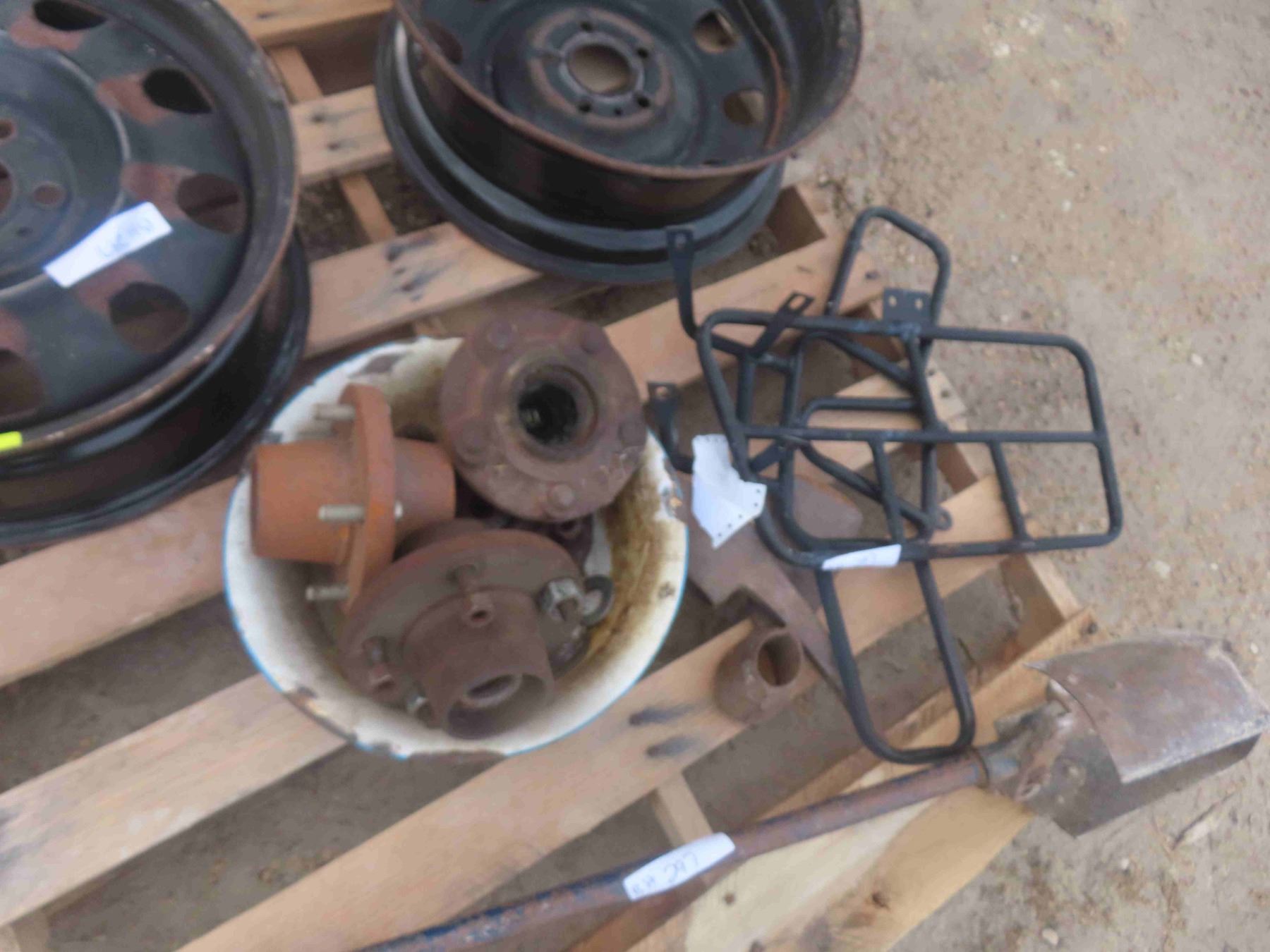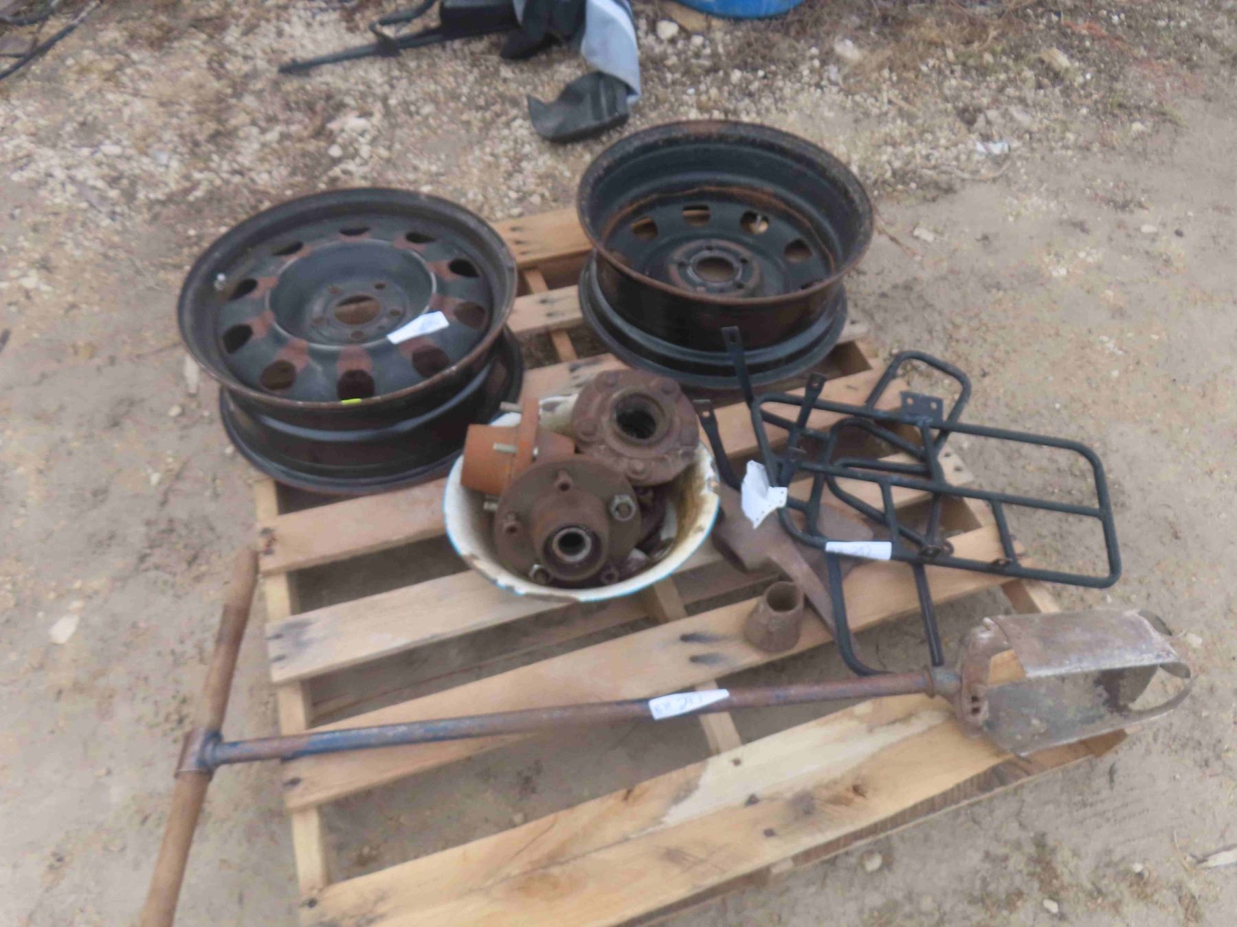 Pallet Lot: 2 Rims Off Dodge ,Hubs ,2 Quad Rails/Rack ,Post Hole Auger